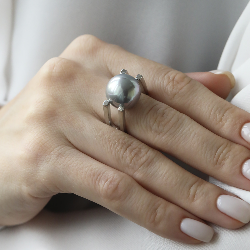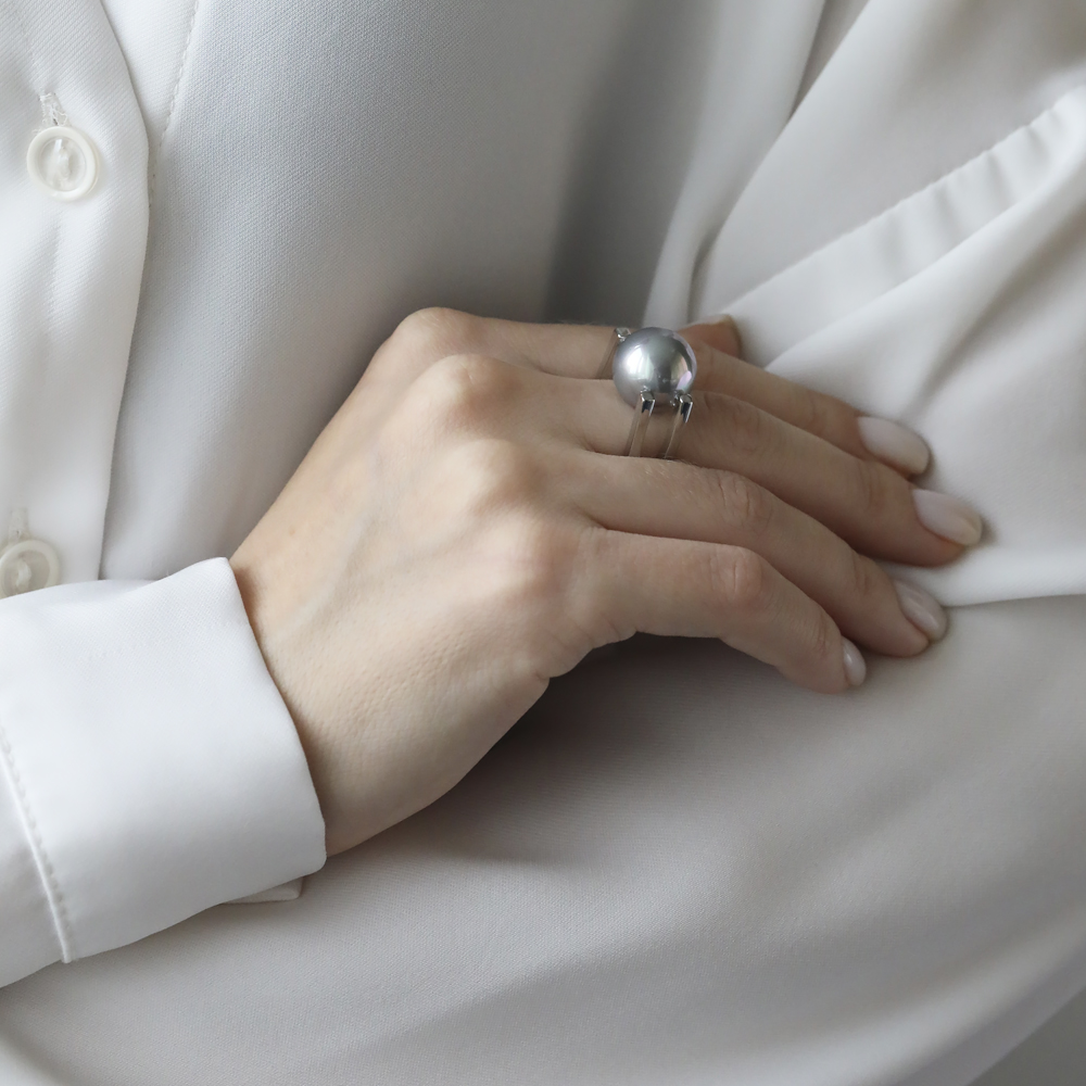 Описание: Изготовлено из ювелирного сплава на основе латуни с гальваническим покрытием родием. Изделие украшает майорский круглый жемчуг серо-голубого цвета диаметром 14мм