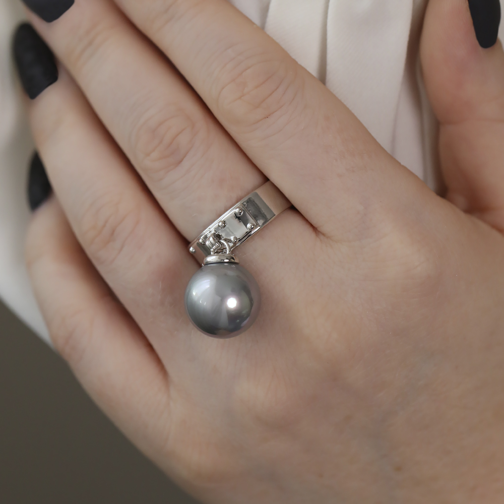 Описание: Изготовлено из ювелирного сплава на основе латуни с гальваническим покрытием родием. Изделие украшает майорский круглый жемчуг серо-голубого цвета диаметром 14мм.