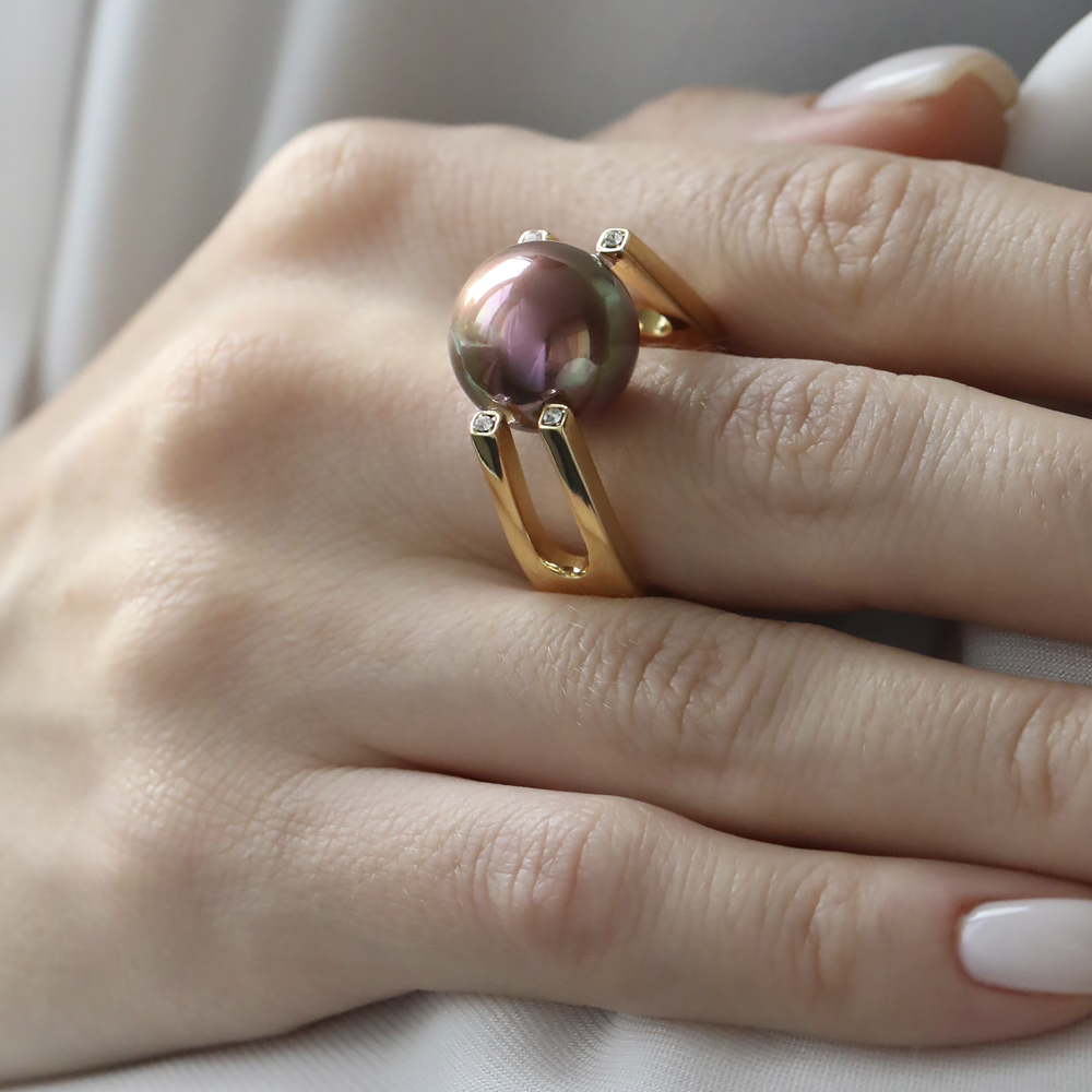 Описание: Изготовлено из ювелирного сплава на основе латуни с гальваническим покрытием золотом. Изделие украшают майорский круглый жемчуг шоколадного цвета диаметром 14мм и кубики циркония.