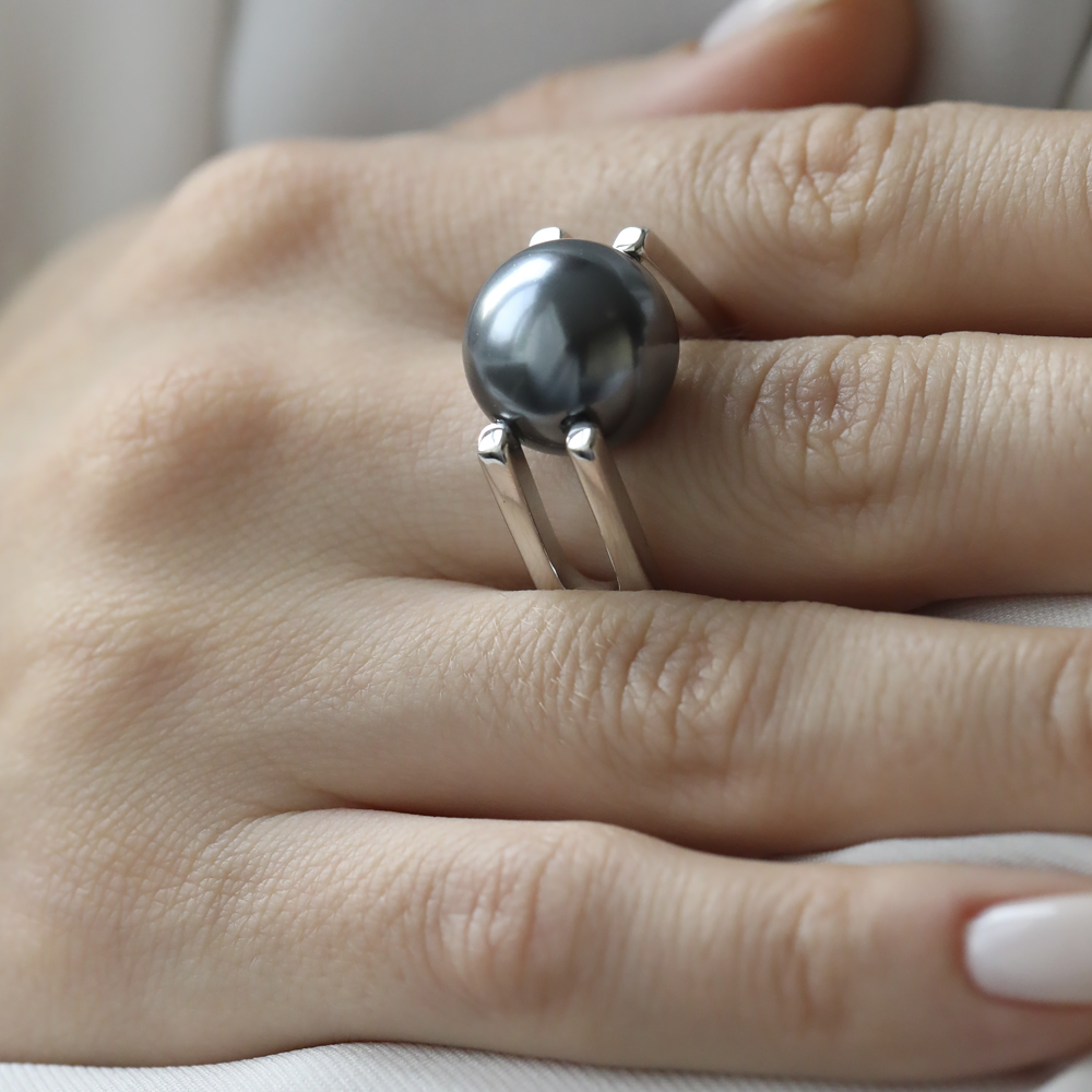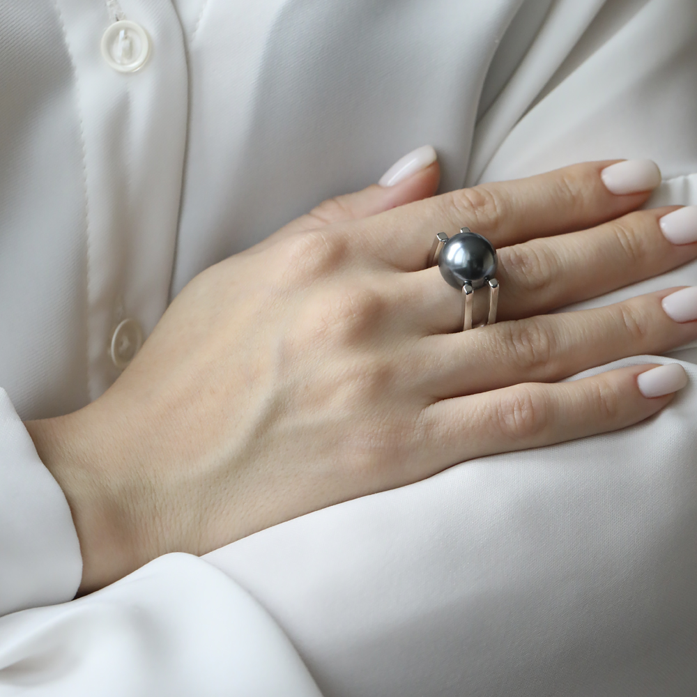 Описание: Изготовлено из ювелирного сплава на основе латуни с гальваническим покрытием родием. Изделие украшает майорский круглый жемчуг темно-серого цвета диаметром 14мм.