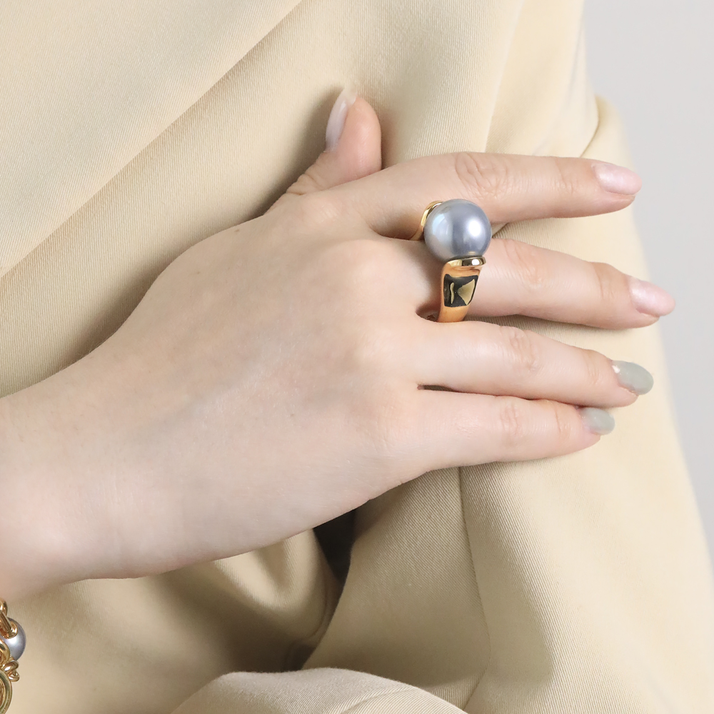 Описание: Изготовлено из ювелирного сплава на основе латуни с гальваническим покрытием золотом. Изделие украшает майорский круглый жемчуг серо-голубого цвета диаметром 16мм.