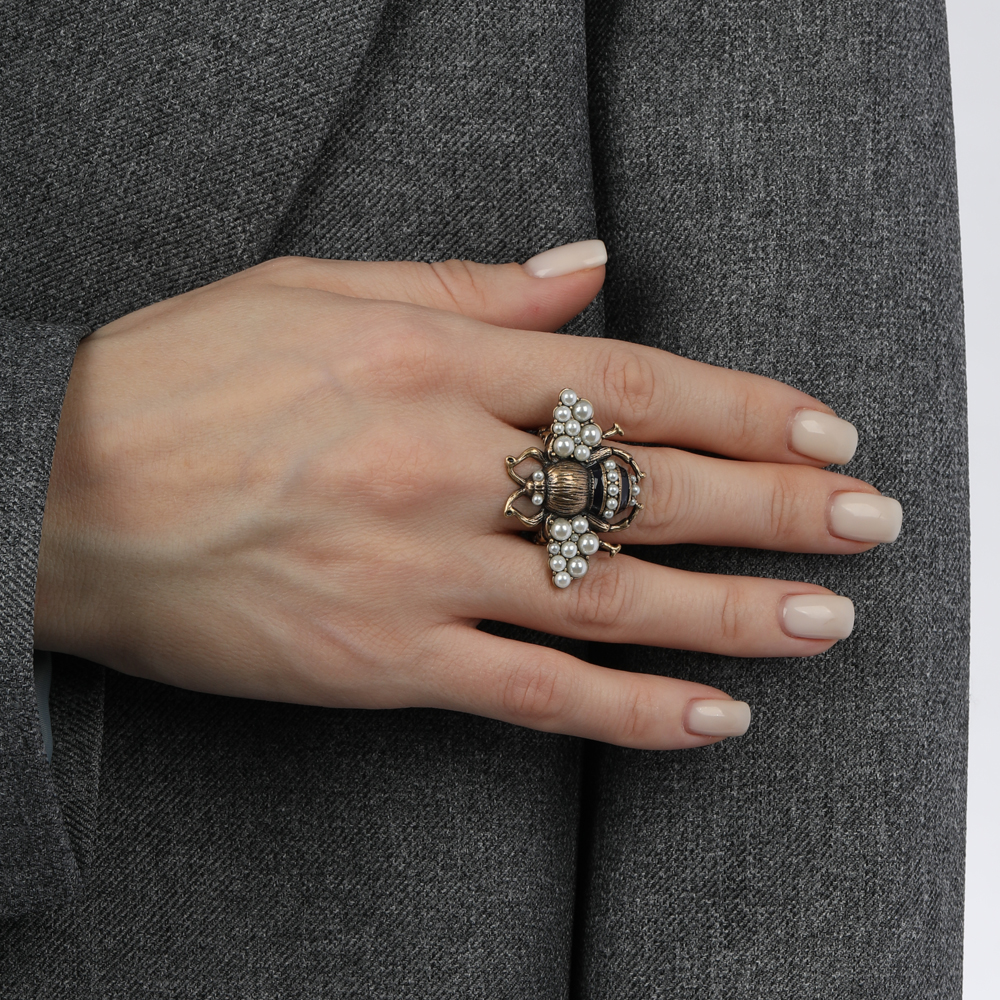 Описание: Изготовлено из ювелирного сплава на основе латуни с гальваническим покрытием античным золотом. Изделие украшают жемчуг Майорка белого цвета и черная эмаль. Размер украшения 4х3см.