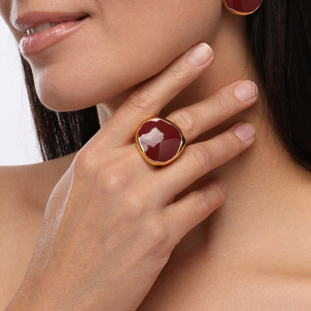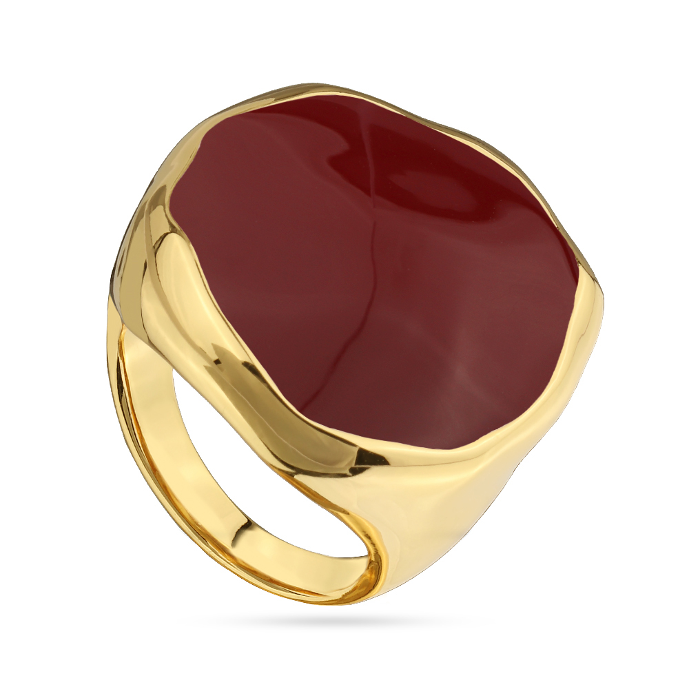 Описание: Изготовлено из ювелирного сплава на основе латуни с гальваническим покрытием золотом. Изделие украшает эмаль цвета бургунди. Ширина кольца 2, 5см.