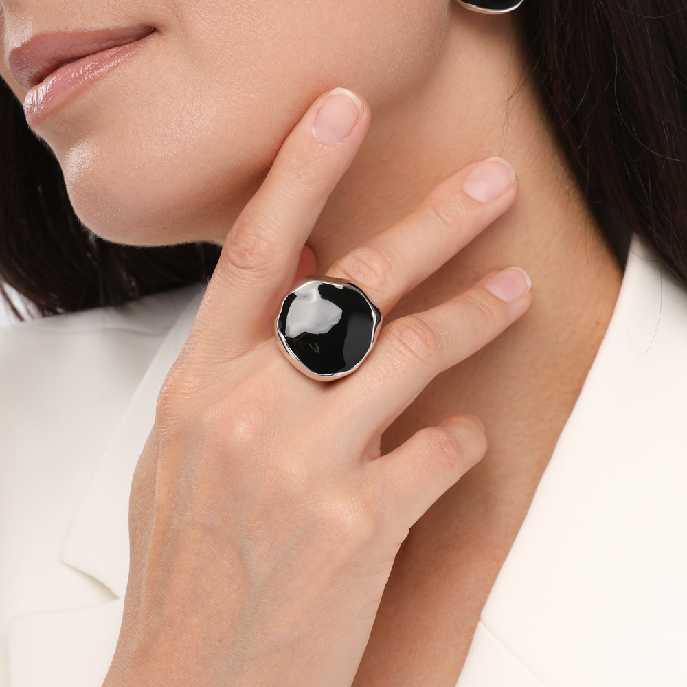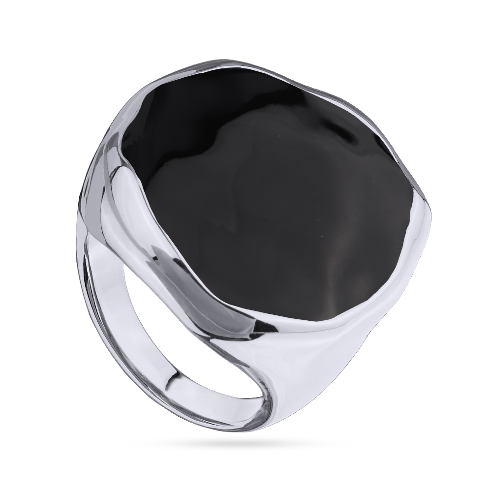 Описание: Изготовлено из ювелирного сплава на основе латуни с гальваническим покрытием родием. Изделие украшает эмаль черного цвета. Ширина кольца 2, 5см.