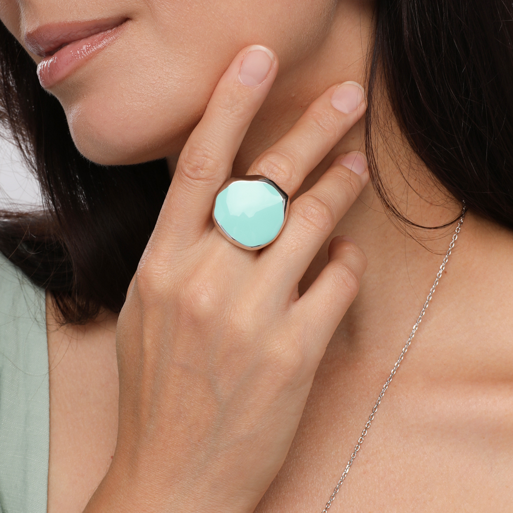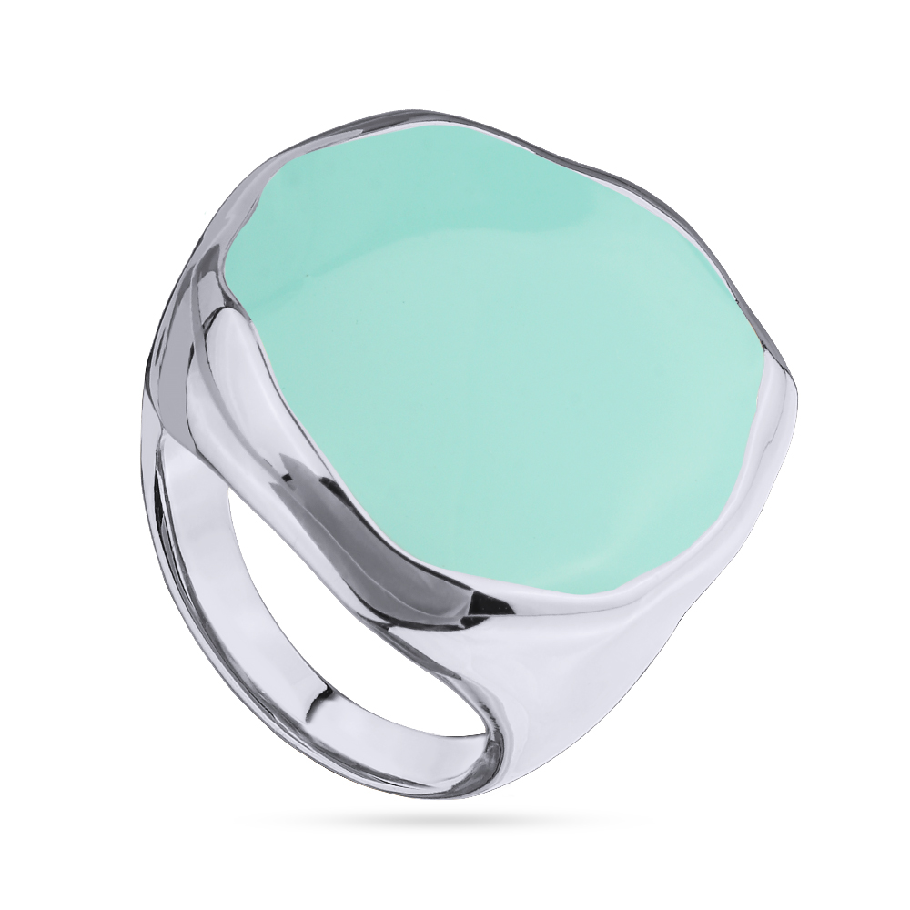 Описание: Изготовлено из ювелирного сплава на основе латуни с гальваническим покрытием родием. Изделие украшает эмаль цвета морская свежесть. Ширина кольца 2, 5см.