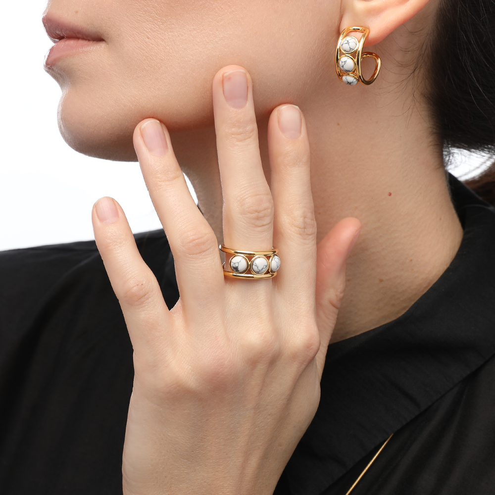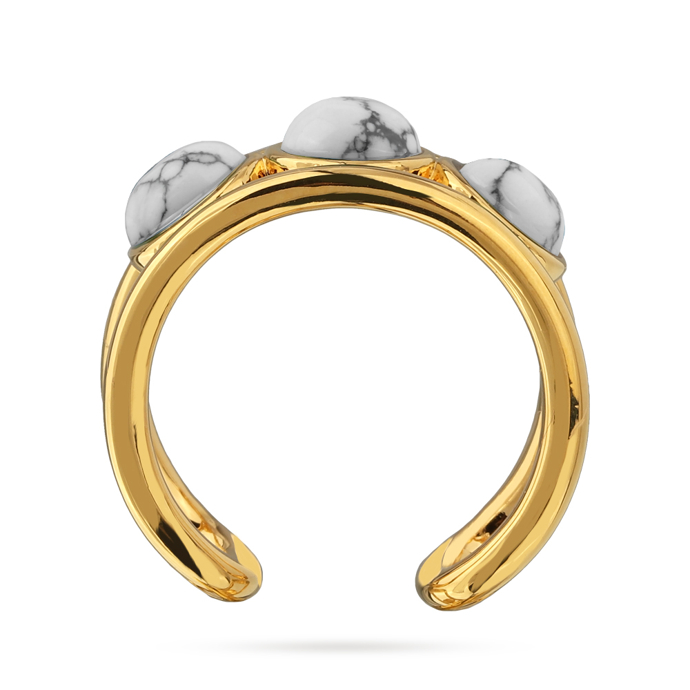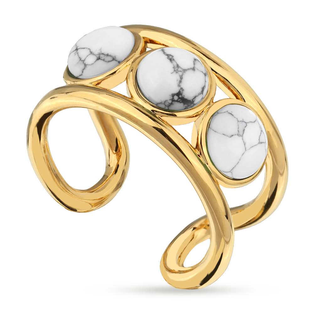 Описание: Изготовлено из ювелирного сплава на основе латуни с гальваническим покрытием золотом. Изделие украшает белая бирюза. Ширина 1см.