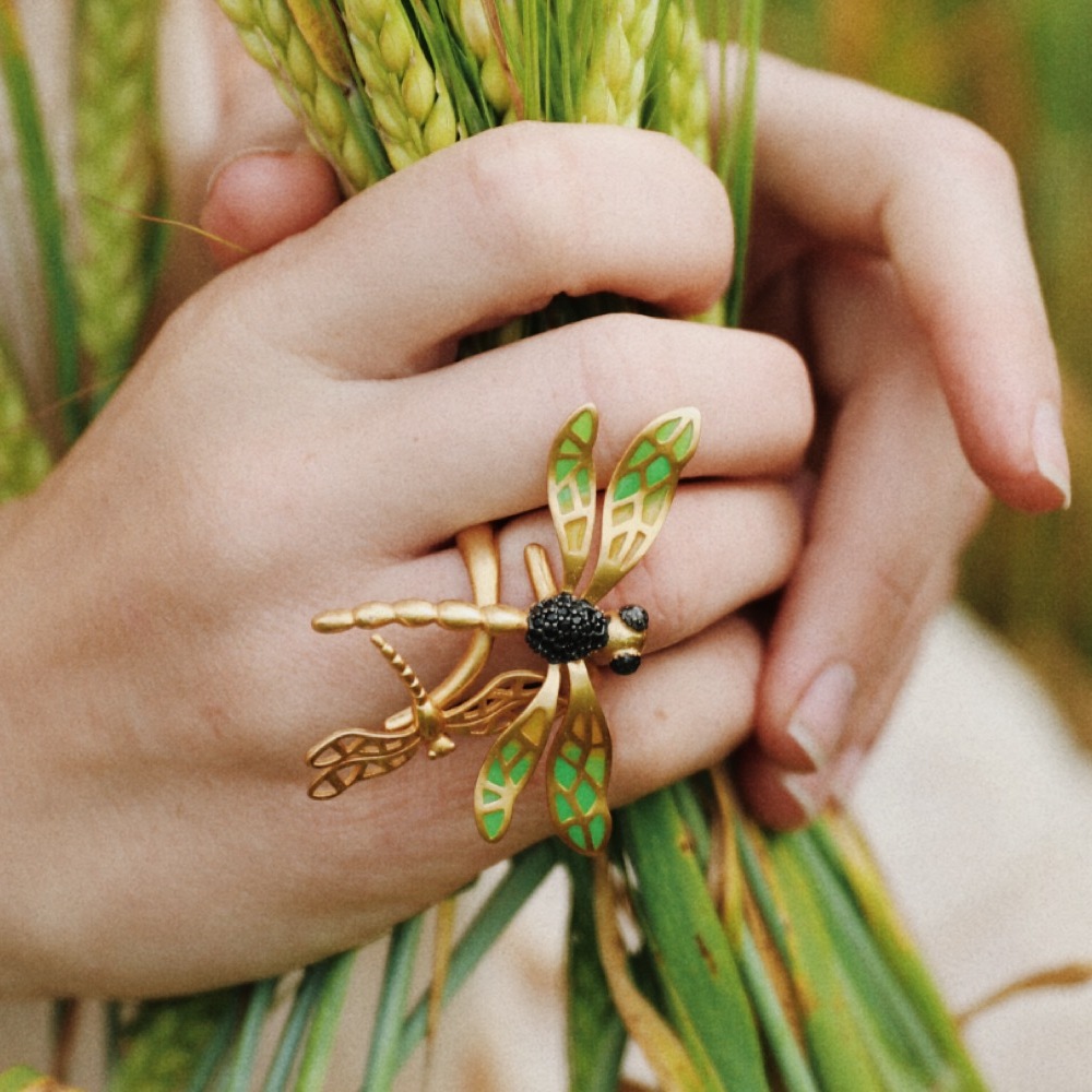 Описание: Изготовлено из ювелирного сплава на основе латуни с гальваническим покрытием матовым золотом. Изделие вручную расписано ювелирной краской зеленого и желтого цвета, покрыто эмалью и украшено черным агатом и фианитами. Размер украшения 6х4см.