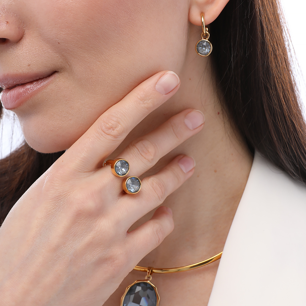 Описание: Изготовлено из ювелирного сплава на основе латуни с гальваническим покрытием золотом. Изделие украшают кристаллы SW дымчато-серого цвета диаметром 8мм.