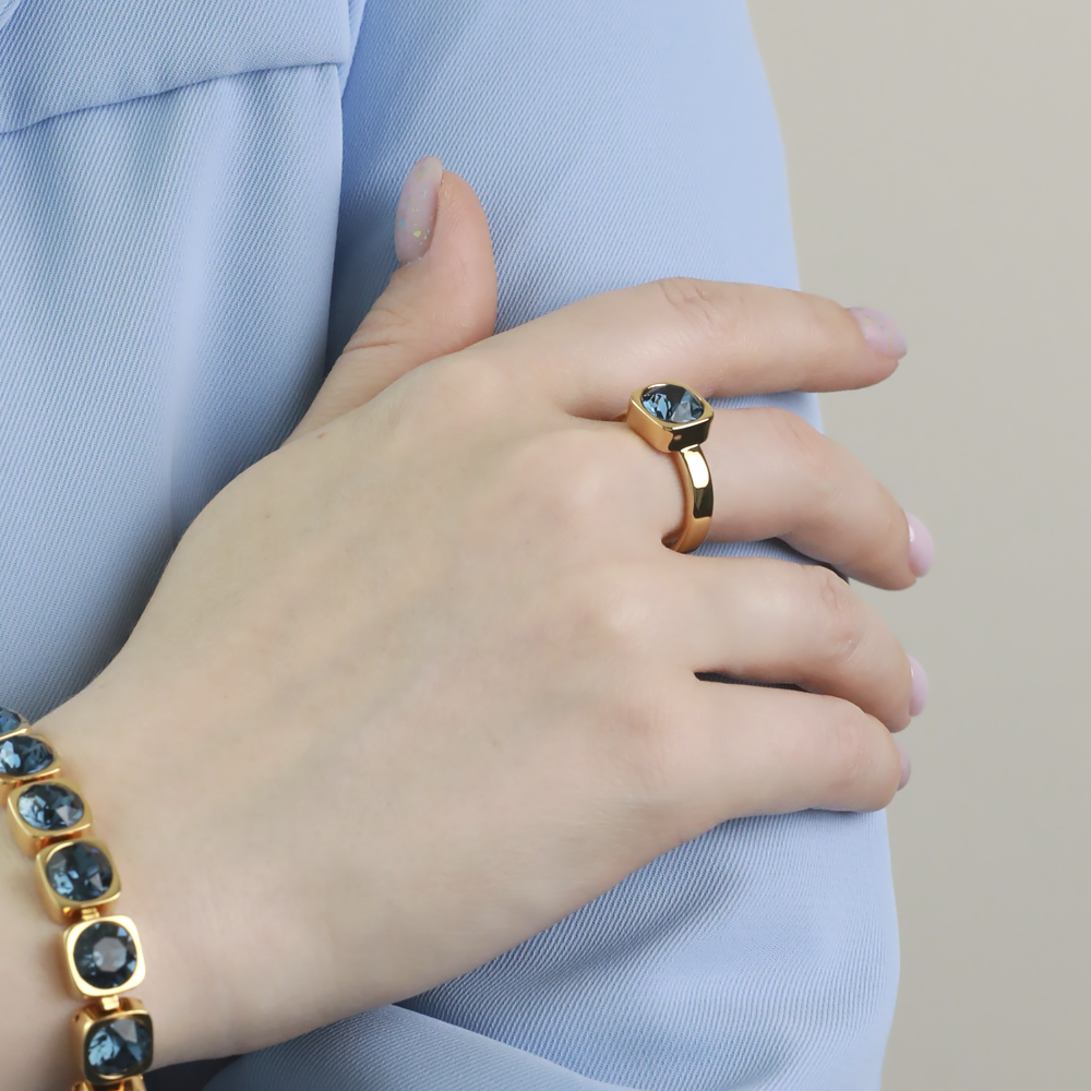 Описание: Изготовлено из ювелирного сплава на основе латуни с гальваническим покрытием золотом. Изделие украшают кристаллы SW темно-синего цвета диаметром 8мм.