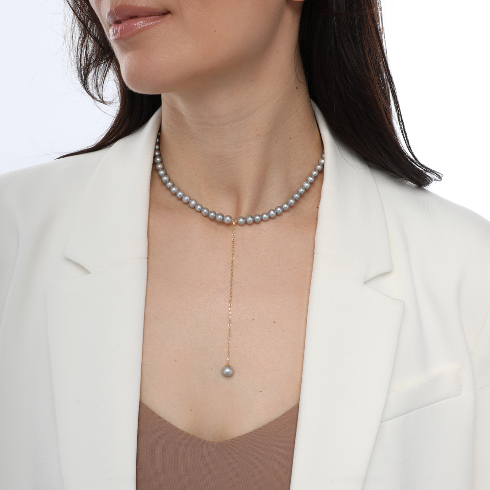 Описание: Изготовлено из ювелирного сплава на основе латуни с гальваническим покрытием золотом. Изделие украшает жемчуг диаметром 5-9мм серо-голубого цвета. Длина колье 38-45см.