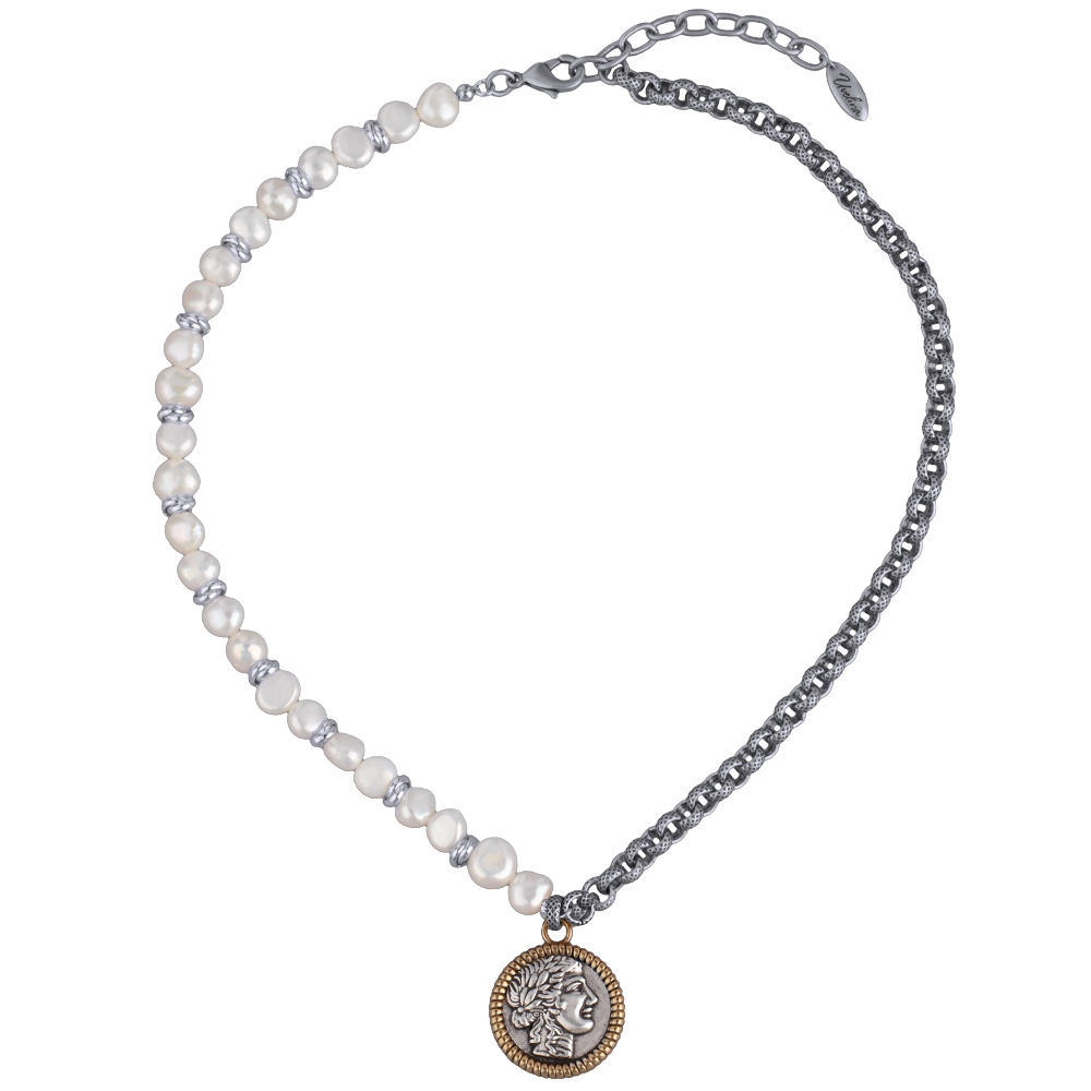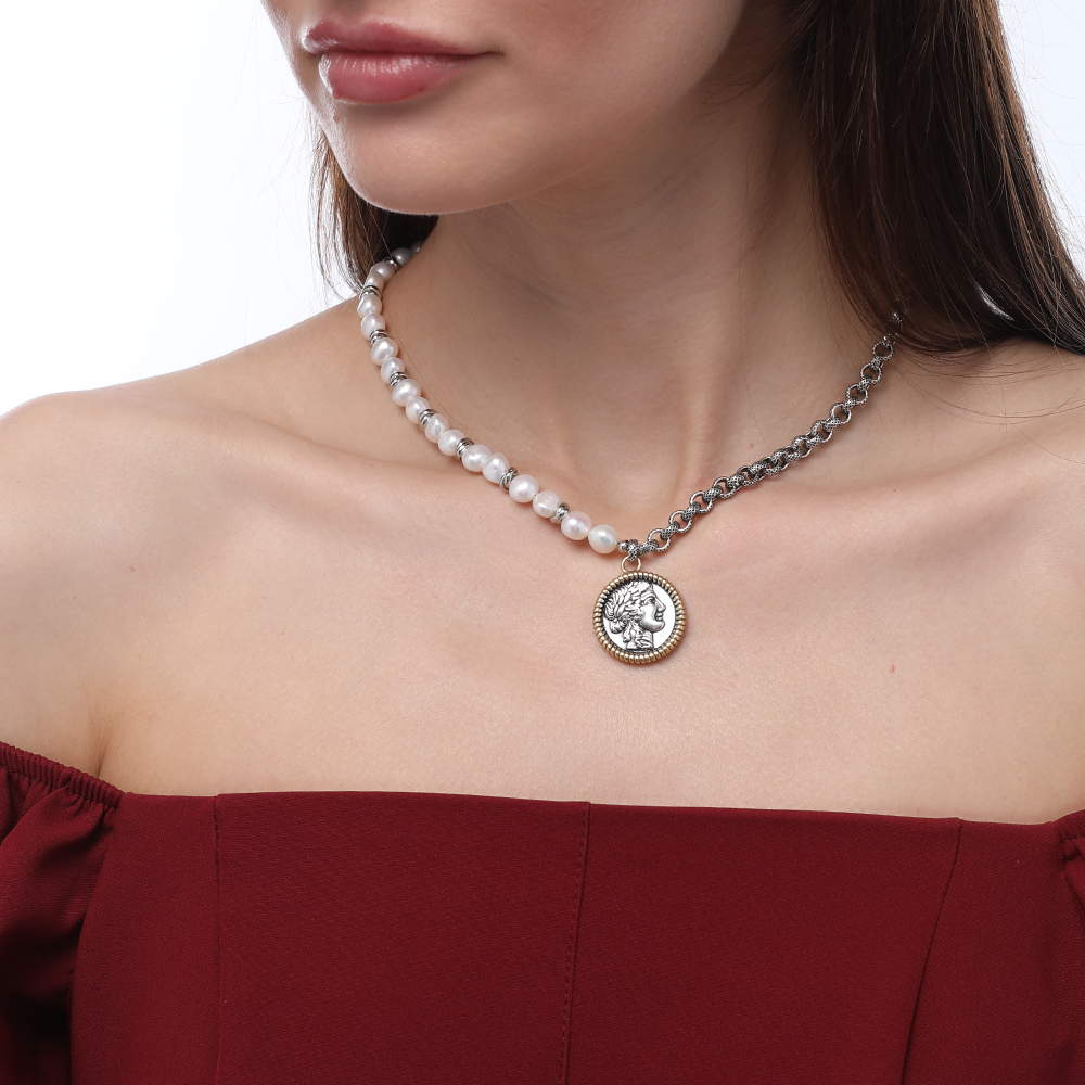 Описание: Изготовлено из ювелирного сплава на основе латуни с гальваническим покрытием античным золотом и античным серебром. Изделие украшает белый жемчуг диаметром 7-8мм. Длина колье 49см. *Цвет и форма жемчужин может отличаться от изображенной на фото.