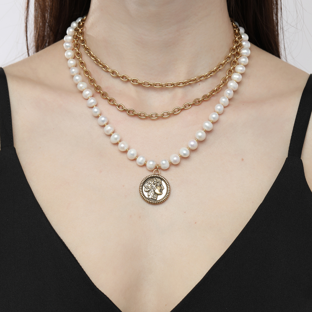 Описание: Изготовлено из ювелирного сплава на основе латуни с гальваническим покрытием античным золотом. Изделие украшает белый жемчуг диаметром 6мм. Длина колье 140см. *Цвет и форма жемчужин может отличаться от изображенной на фото.