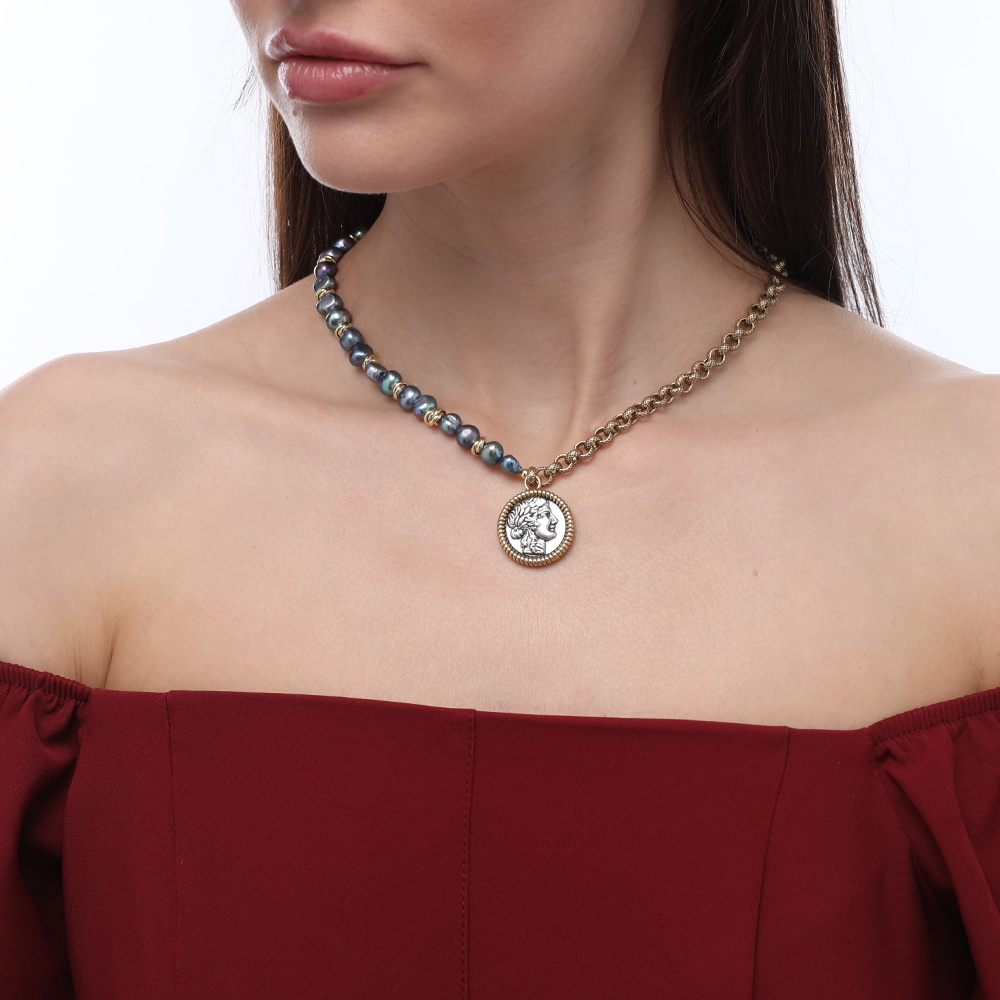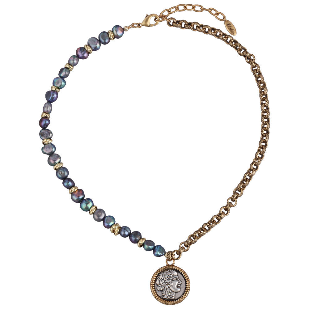 Описание: Изготовлено из ювелирного сплава на основе латуни с гальваническим покрытием античным золотом и античным серебром. Изделие украшает бензиновый жемчуг диаметром 7-8мм. Длина колье 49см. *Цвет и форма жемчужин может отличаться от изображенной на фото.