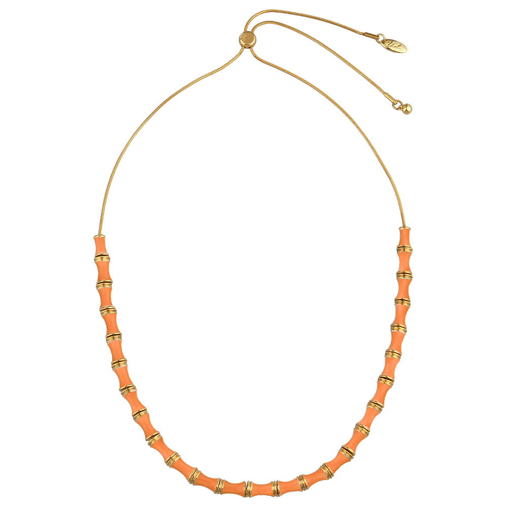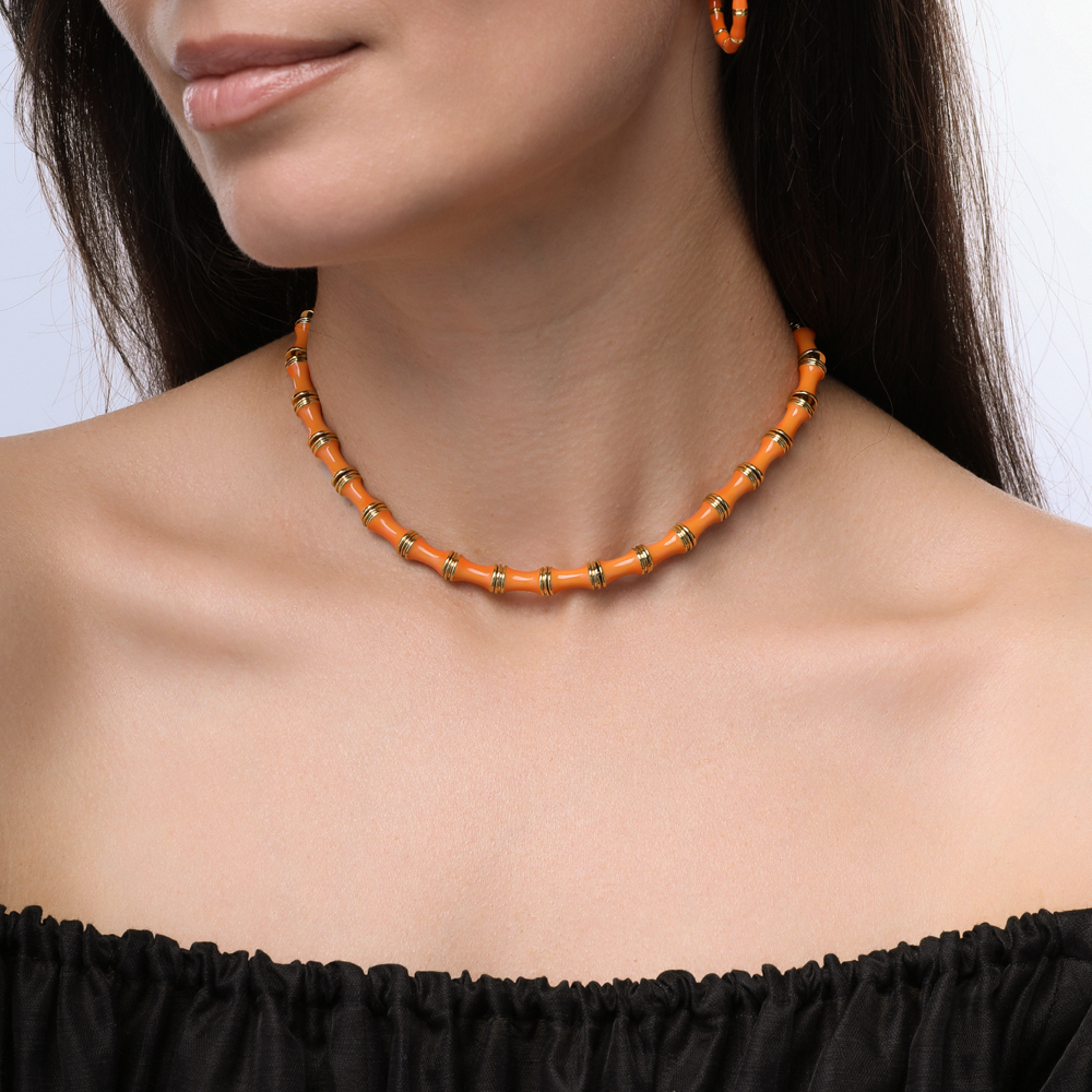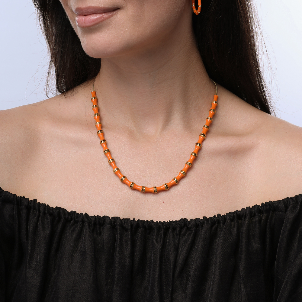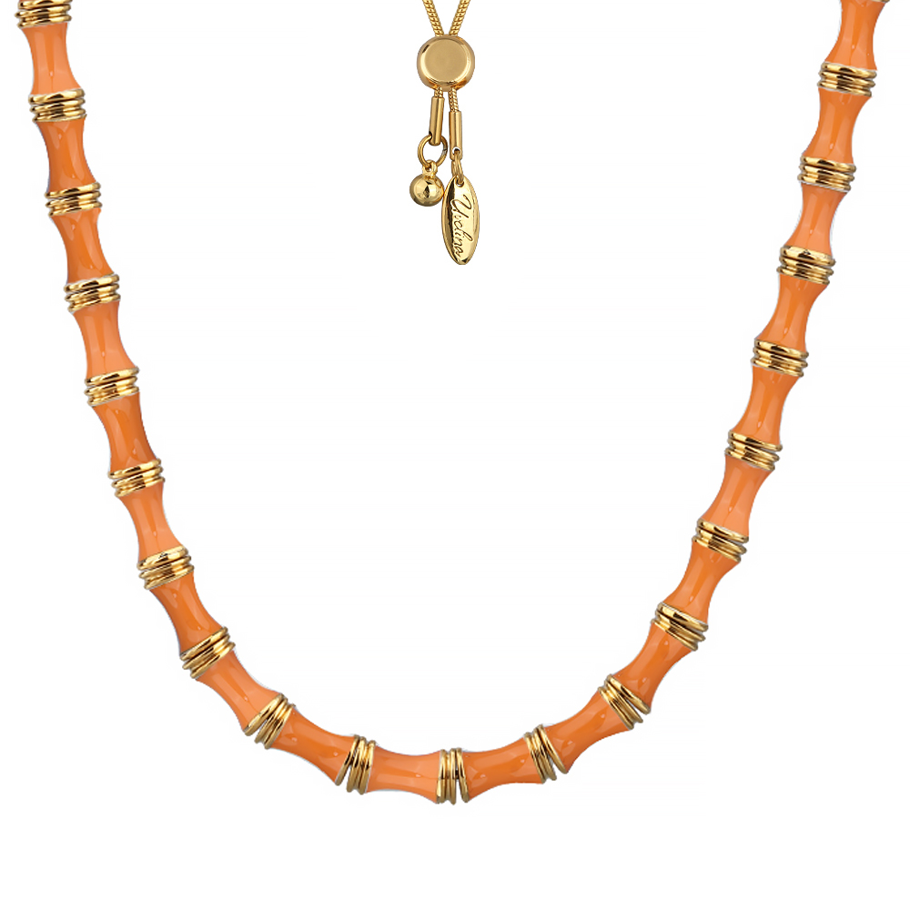 Описание: Изготовлено из ювелирного сплава на основе латуни с гальваническим покрытием золотом. Изделие украшает оранжевая эмаль. На цепочке установлен регулятор длины. Максимальная длина цепочки 70см.