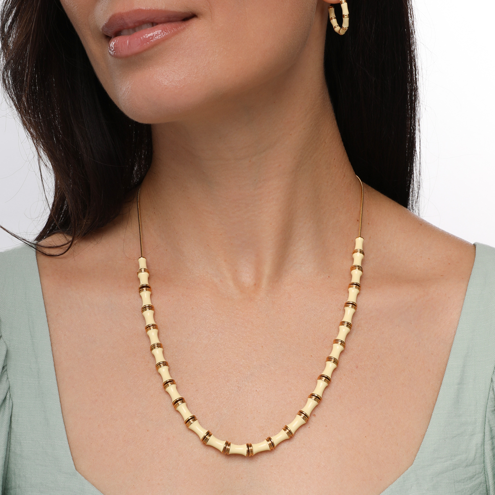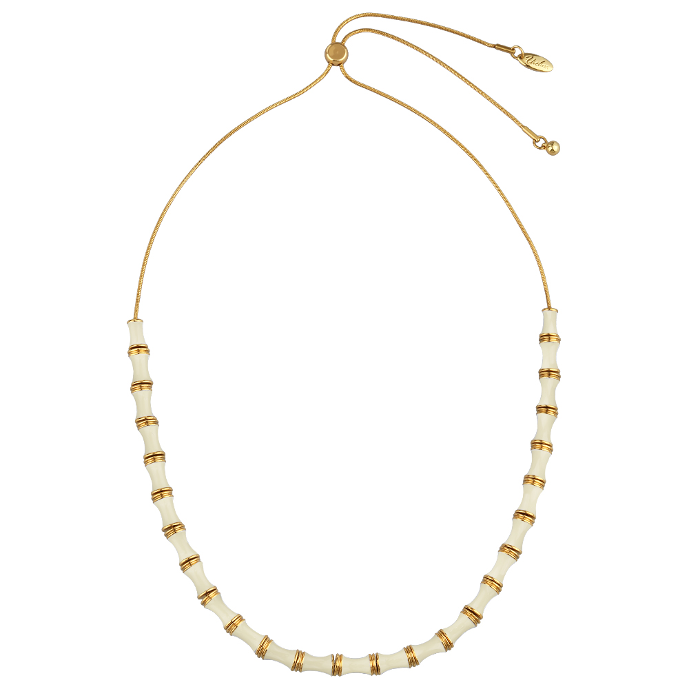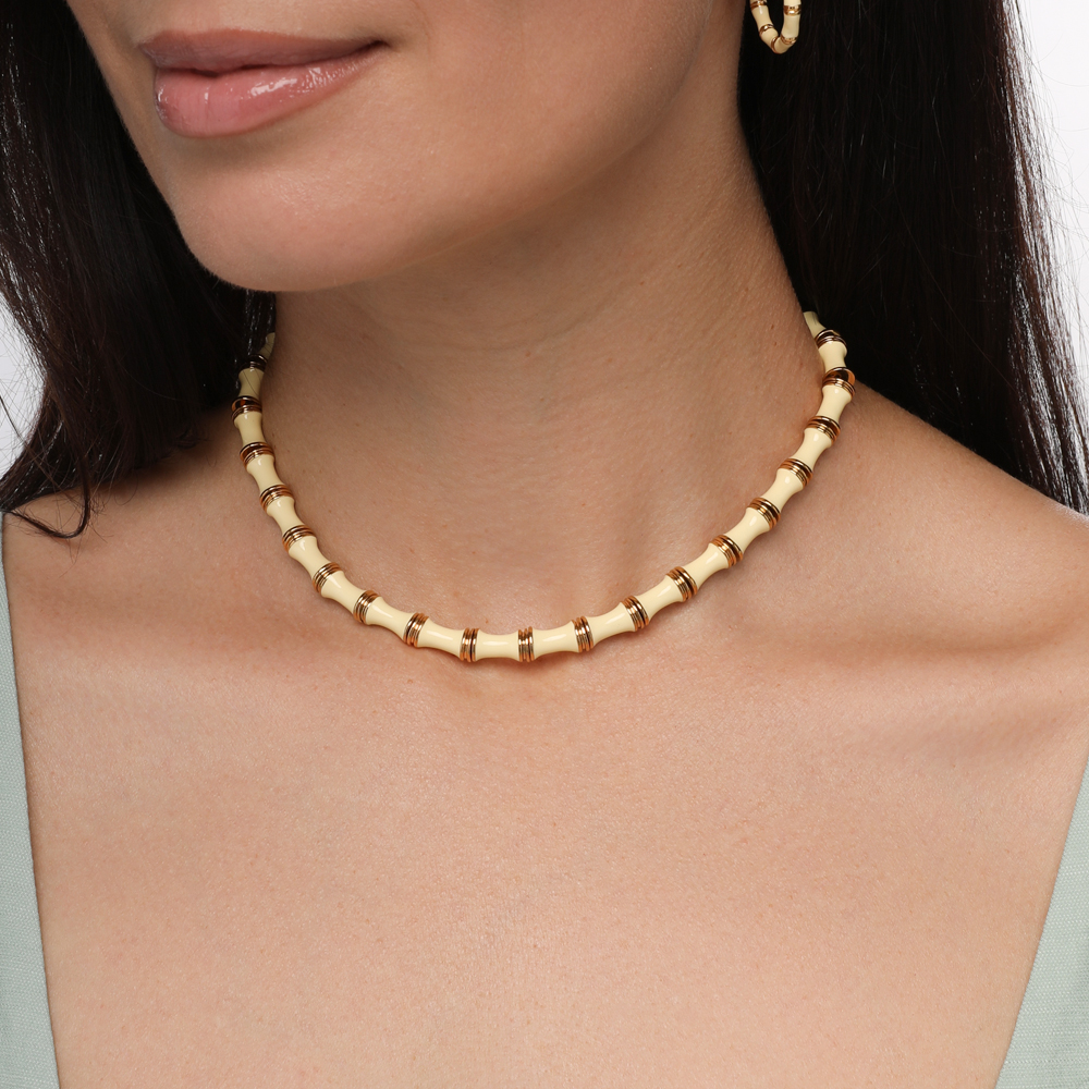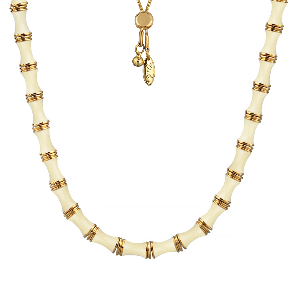 Описание: Изготовлено из ювелирного сплава на основе латуни с гальваническим покрытием золотом. Изделие украшает эмаль цвета сливочное масло. На цепочке установлен регулятор длины. Максимальная длина цепочки 70см.