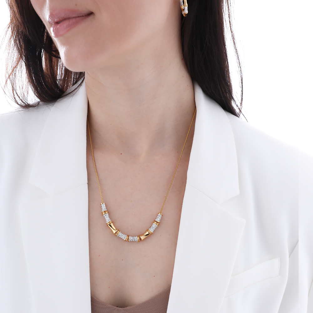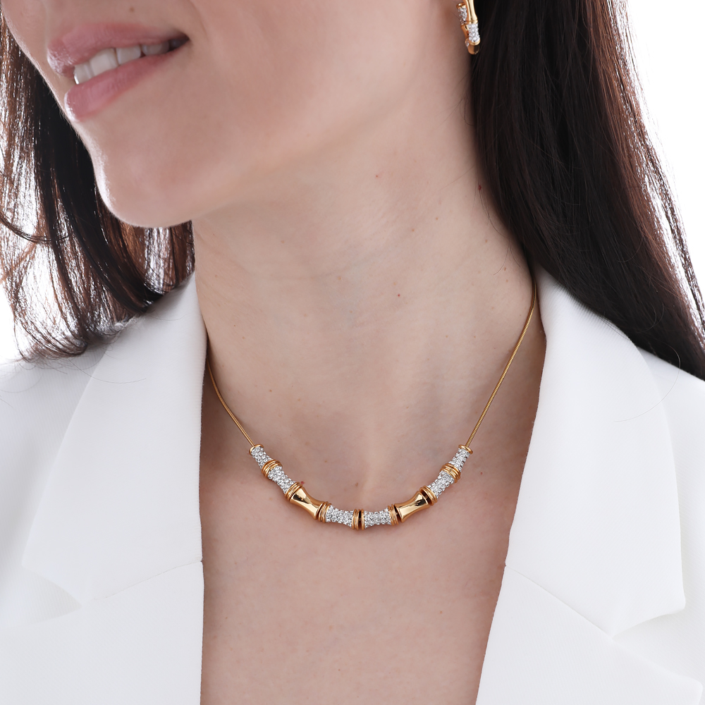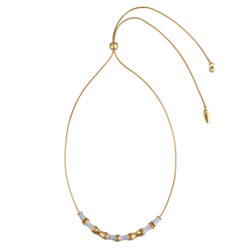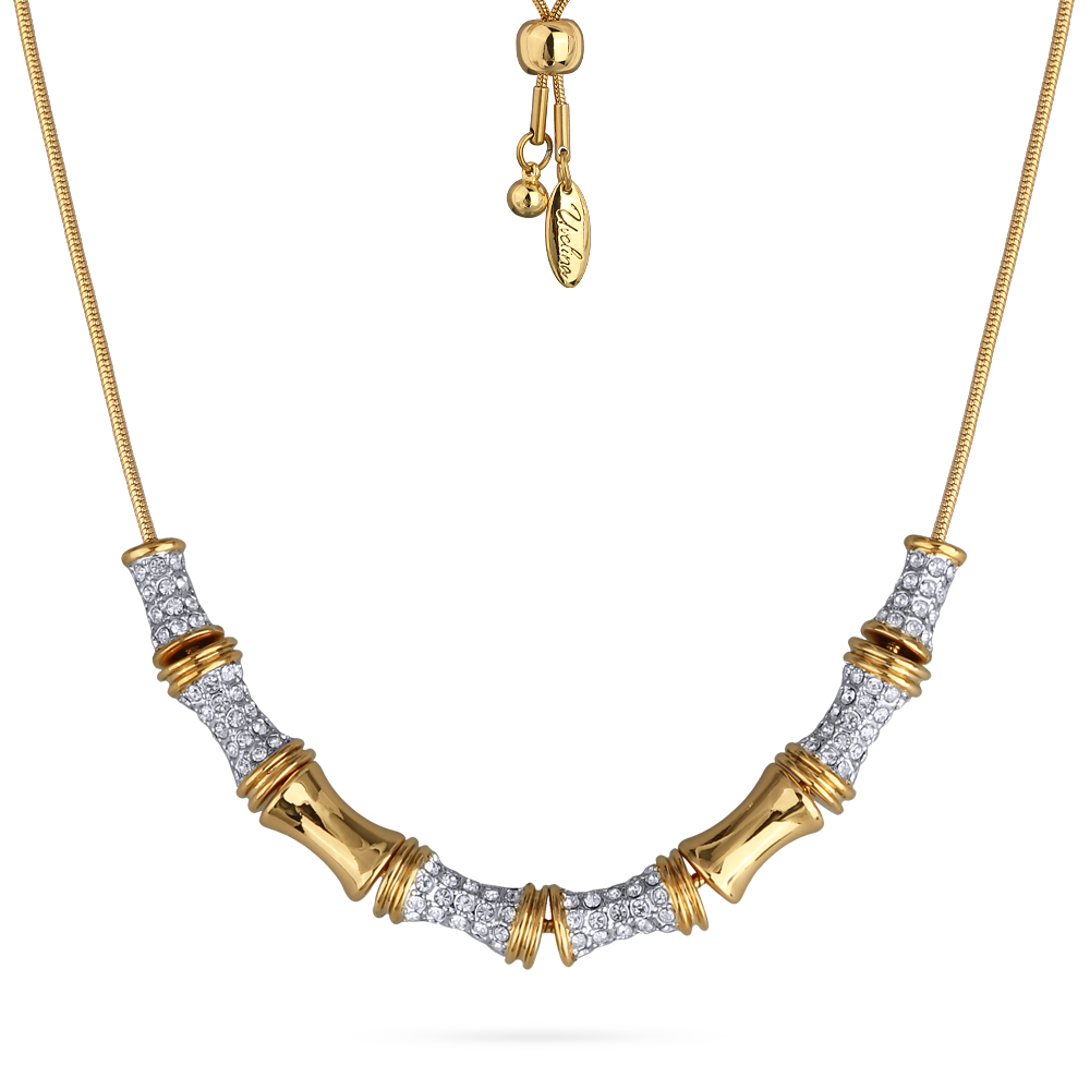 Описание: Изготовлено из ювелирного сплава на основе латуни с гальваническим покрытием золотом и родием. Изделие украшают белые кристаллы. На цепочке установлен регулятор длины. Максимальная длина цепочки 70см
