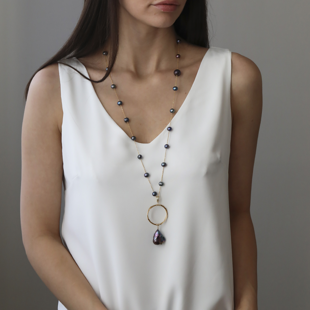 Описание: Изготовлено из ювелирного сплава на основе латуни с гальваническим покрытием золотом. Изделие украшает жемчуг диаметром 5-11мм и барочная жемчужина 1.7х3.5см бензинового цвета. Длина колье 80см.