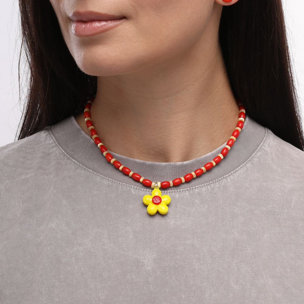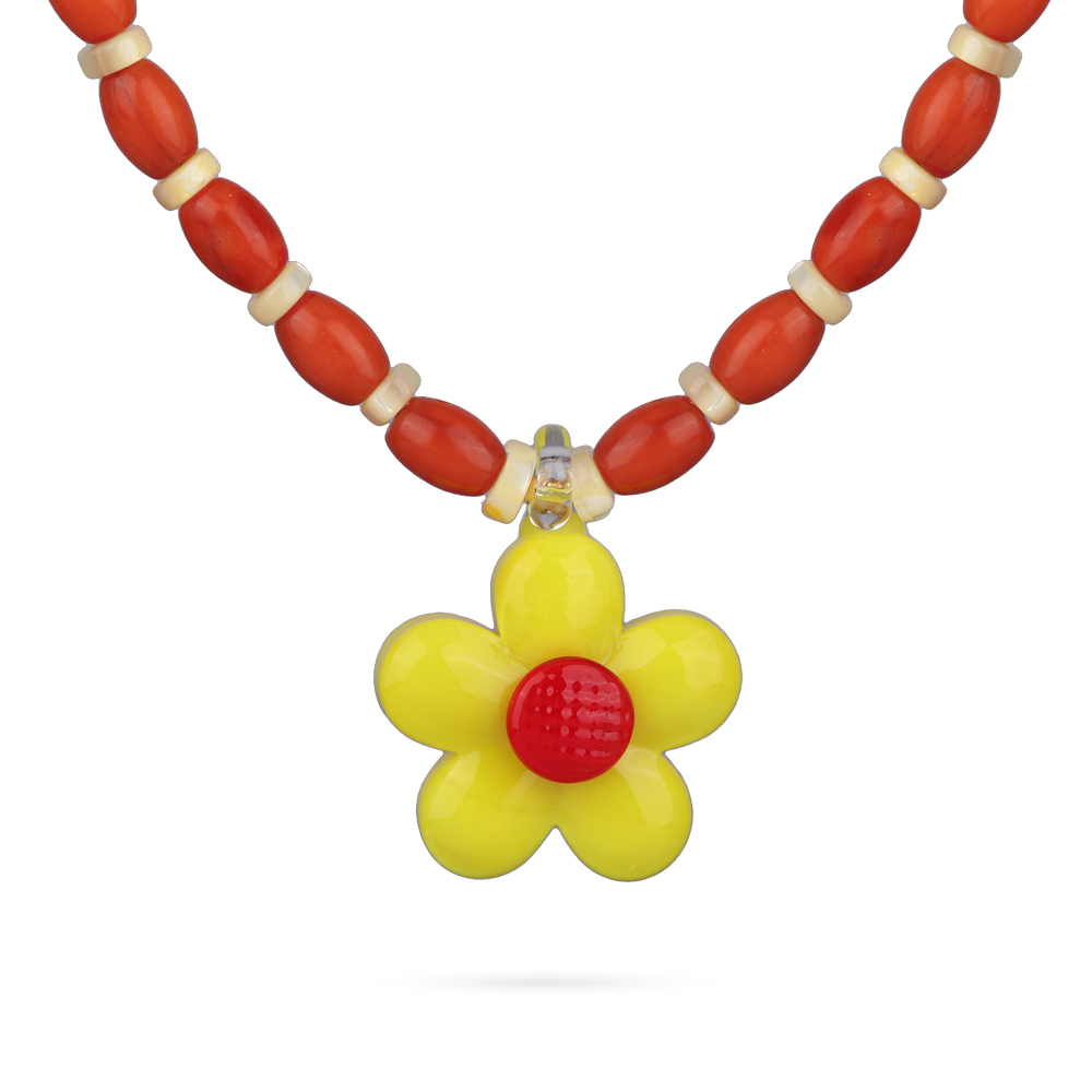 Описание: Изготовлено из ювелирного сплава на основе латуни с гальваническим покрытием золотом. Изделие украшает натуральный красный коралл, перламутр и муранское стекло в виде цветка желтого цвета. Размер украшения 2.2х2.2см. Длина 42см. Замок-карабин с удлинителе