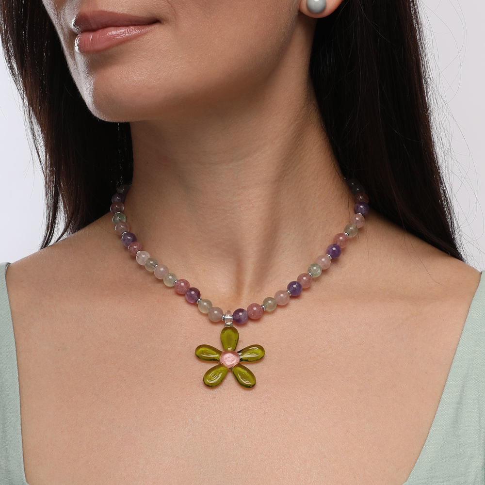 Описание: Изготовлено из ювелирного сплава на основе латуни с гальваническим покрытием родием. Изделие украшает разноцветный кварц и муранское стекло в виде цветка зеленого цвета. Размер украшения 4х3.5см. Длина 42см. Замок-карабин с удлинителем 6см.