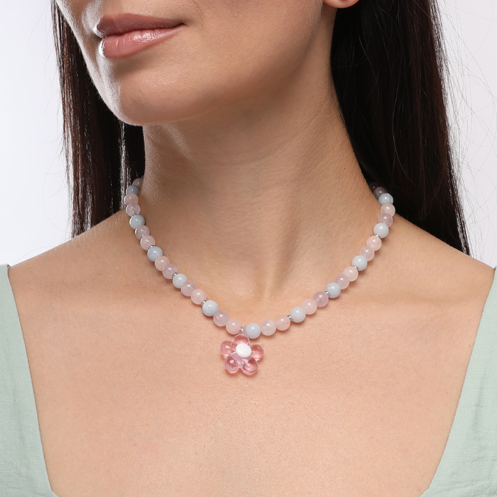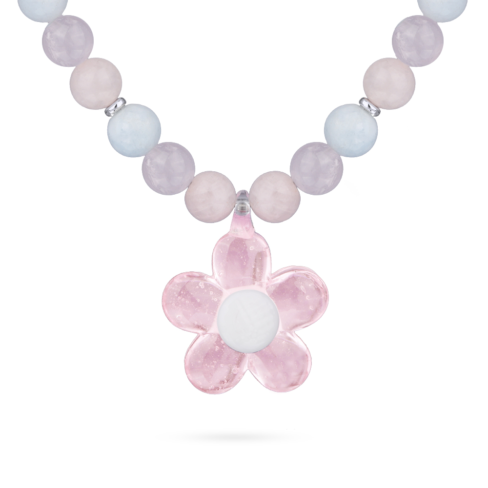 Описание: Изготовлено из ювелирного сплава на основе латуни с гальваническим покрытием родием. Изделие украшает морганит цвета карамельный микс 8мм и муранское стекло в виде цветка розового цвета. Размер украшения 2.2х2.2см. Длина 42см. Замок-карабин с удлинителем