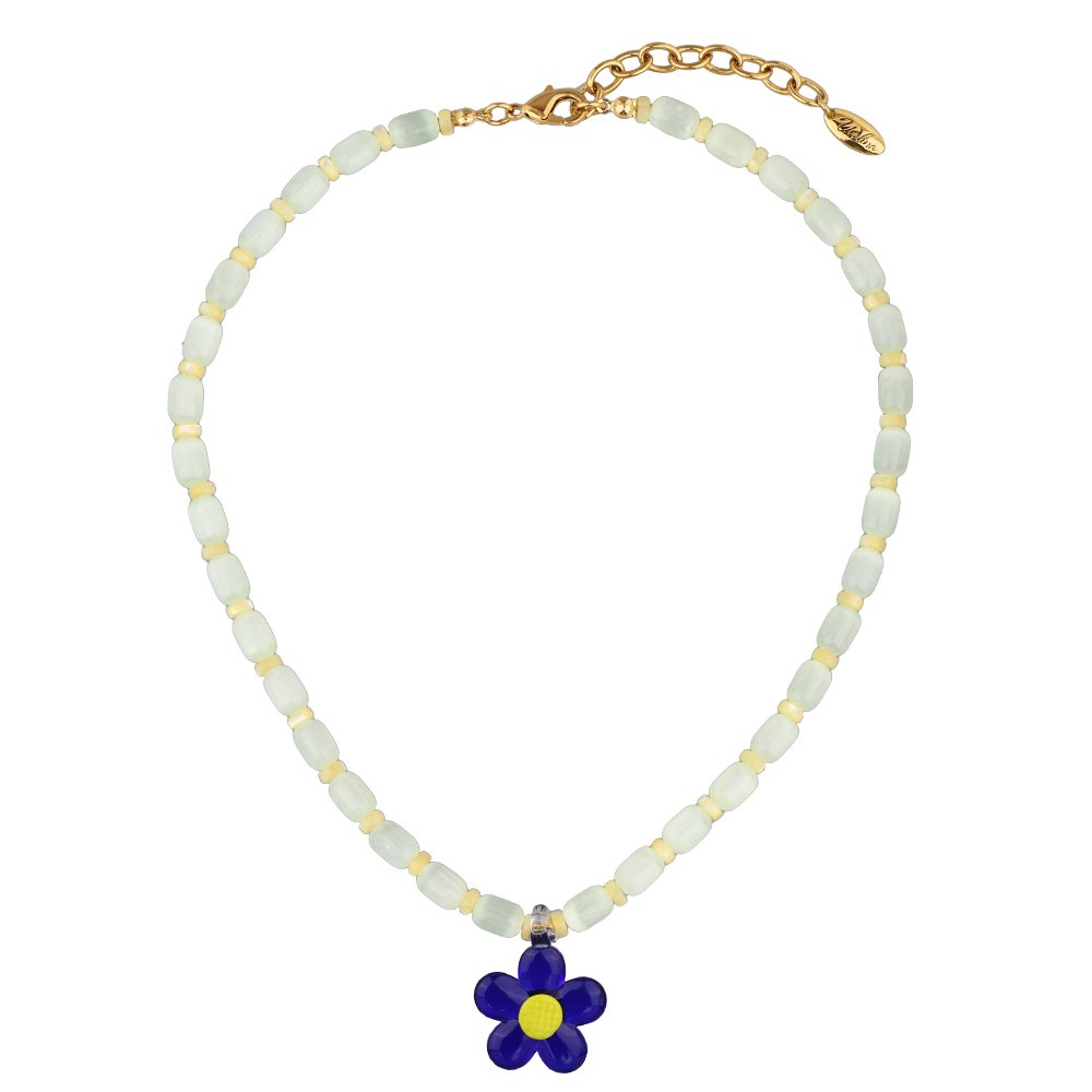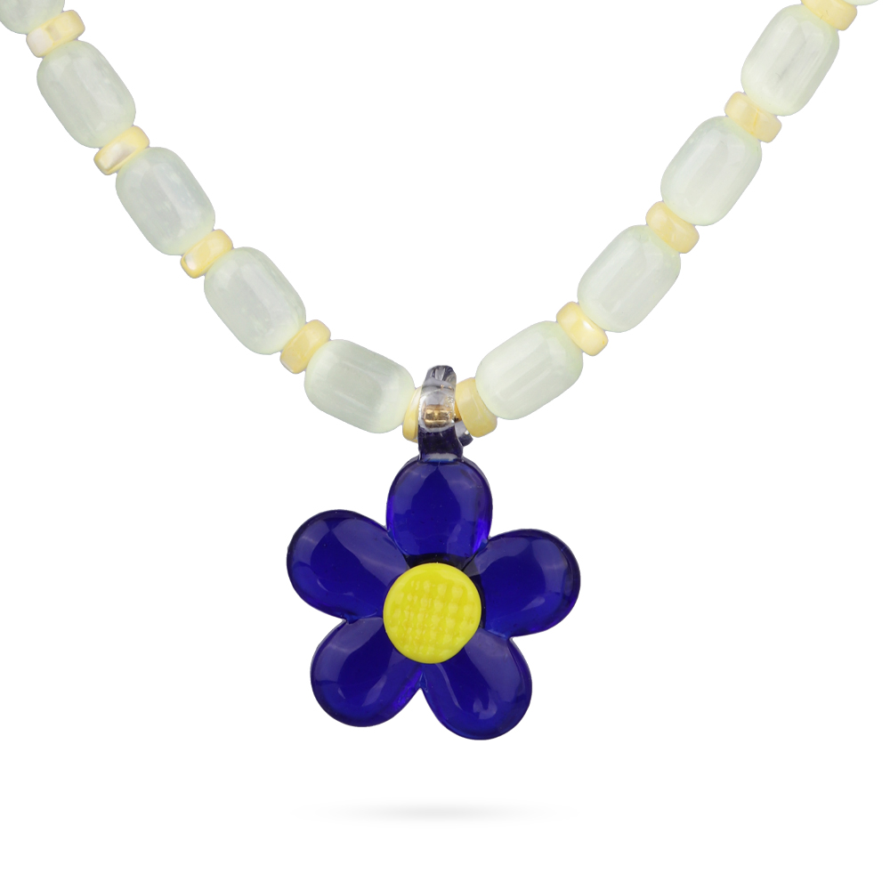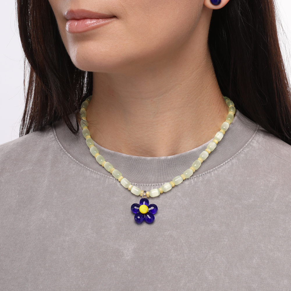 Описание: Изготовлено из ювелирного сплава на основе латуни с гальваническим покрытием золотом. Изделие украшает улексит цвета сливочное масло и синие муранское стекло в виде цветка . Размер украшения 2.2х2.2см. Длина 42см. Замок-карабин с удлинителем 6см.