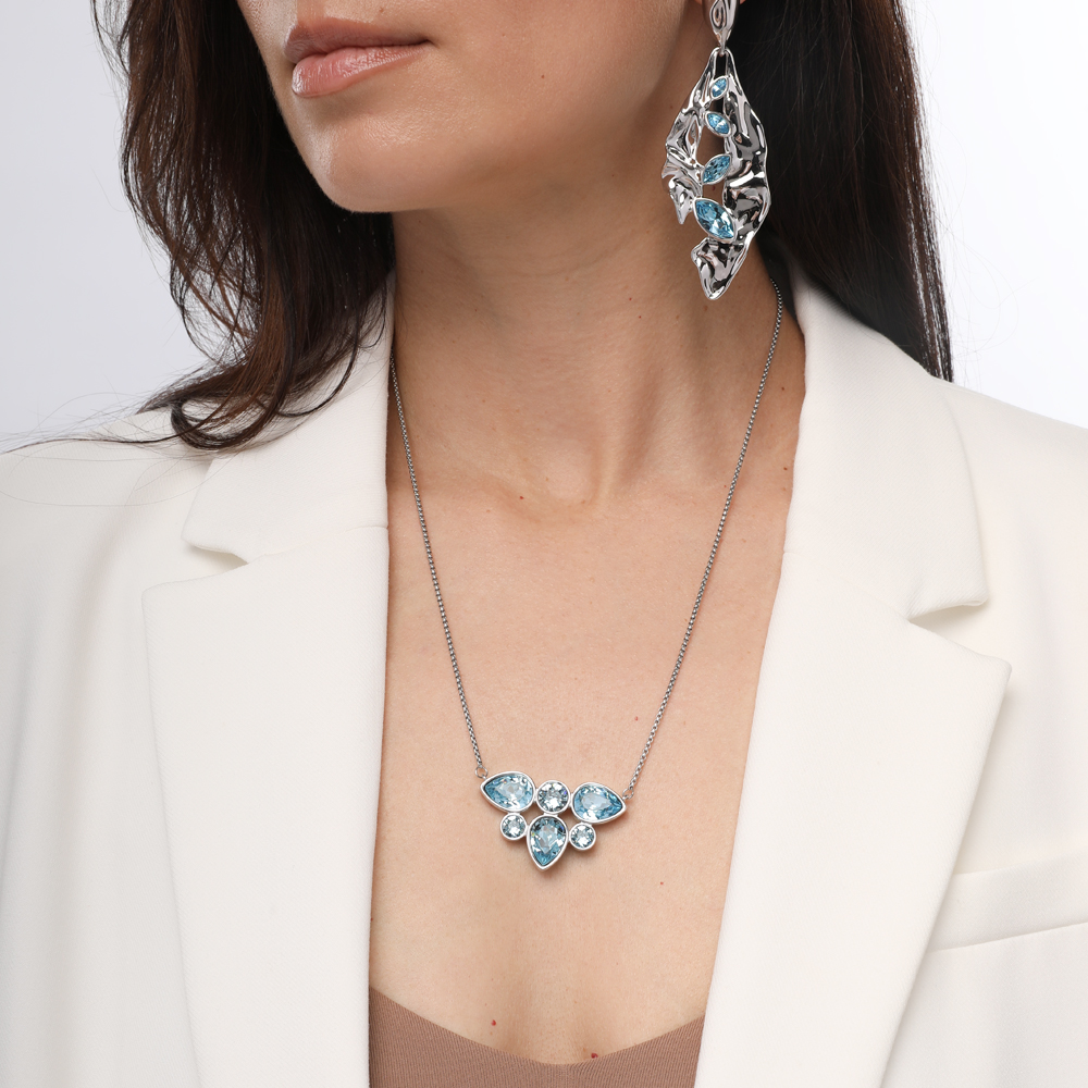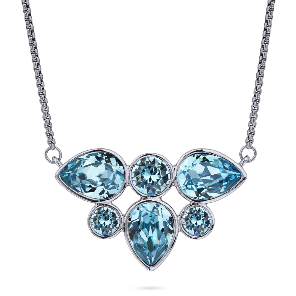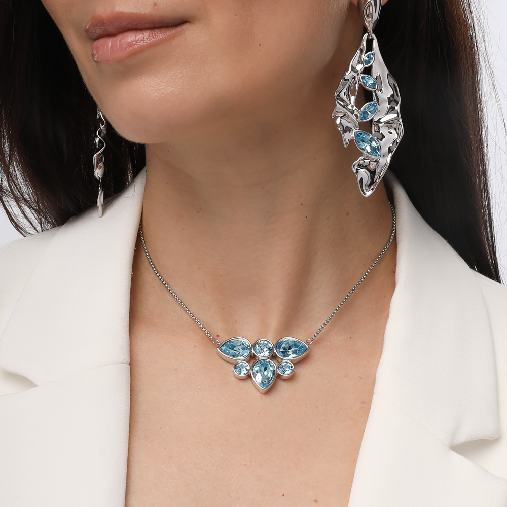 Описание: Изготовлено из ювелирного сплава на основе латуни с гальваническим покрытием родием. Изделие украшают кристаллы SW цвета аквамарин. Длина колье 70см.