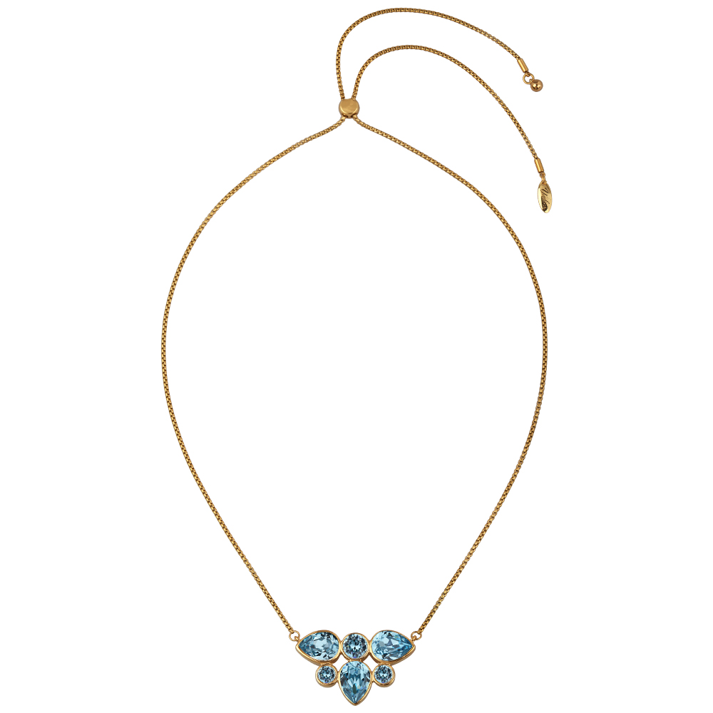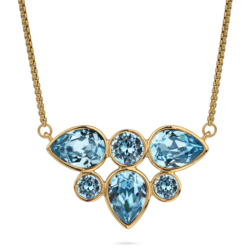 Описание: Изготовлено из ювелирного сплава на основе латуни с гальваническим покрытием золотом. Изделие украшают кристаллы SW цвета аквамарин. Длина колье 70см.