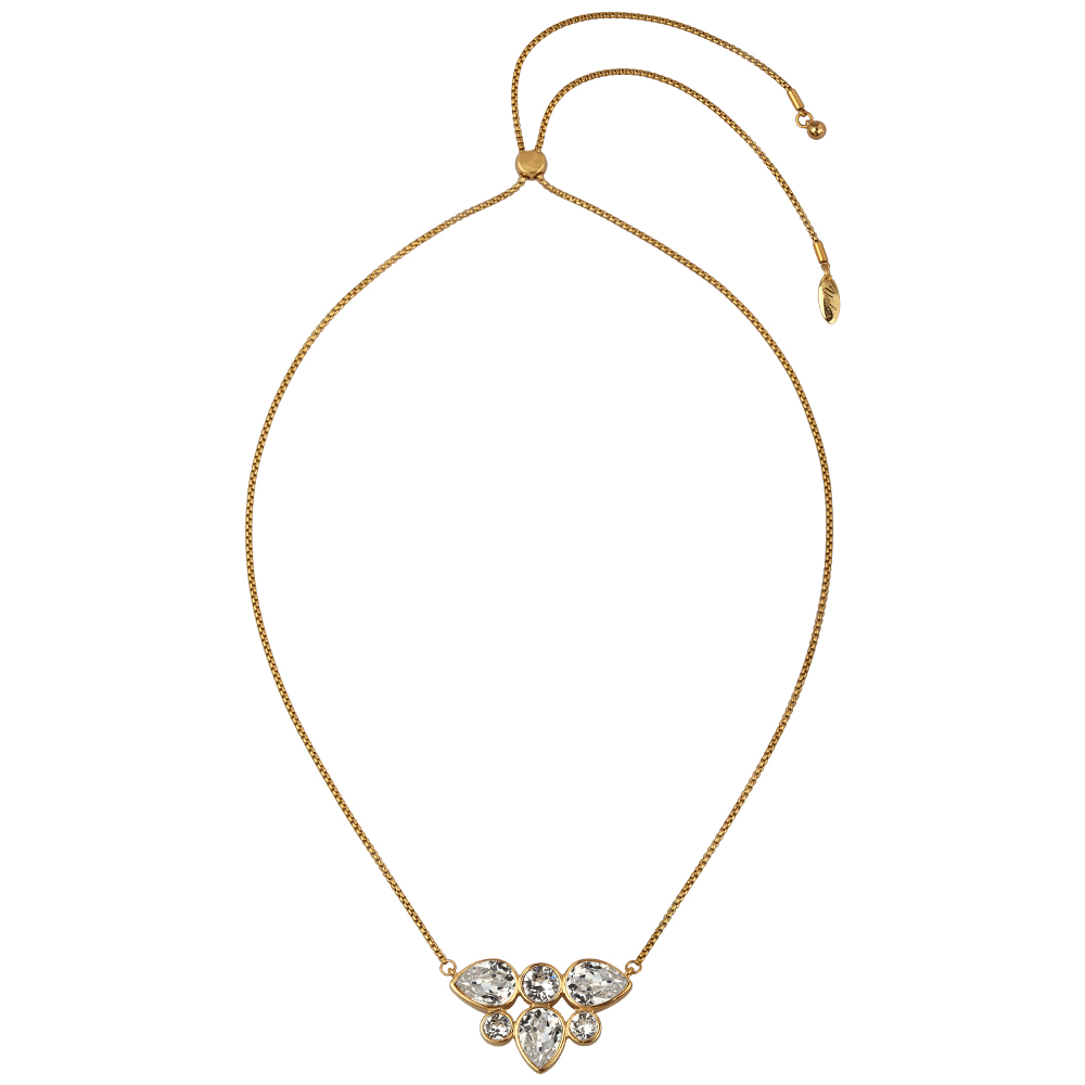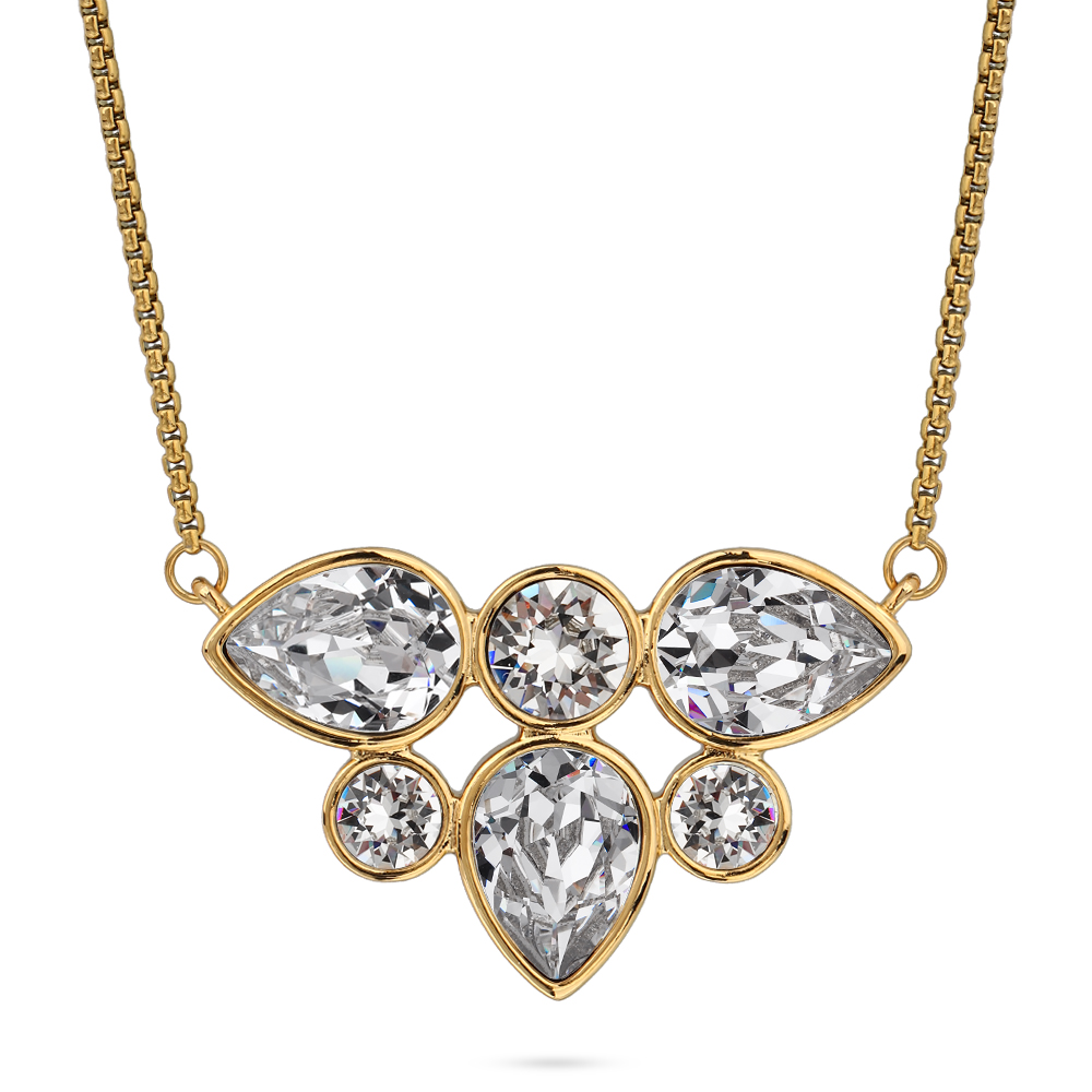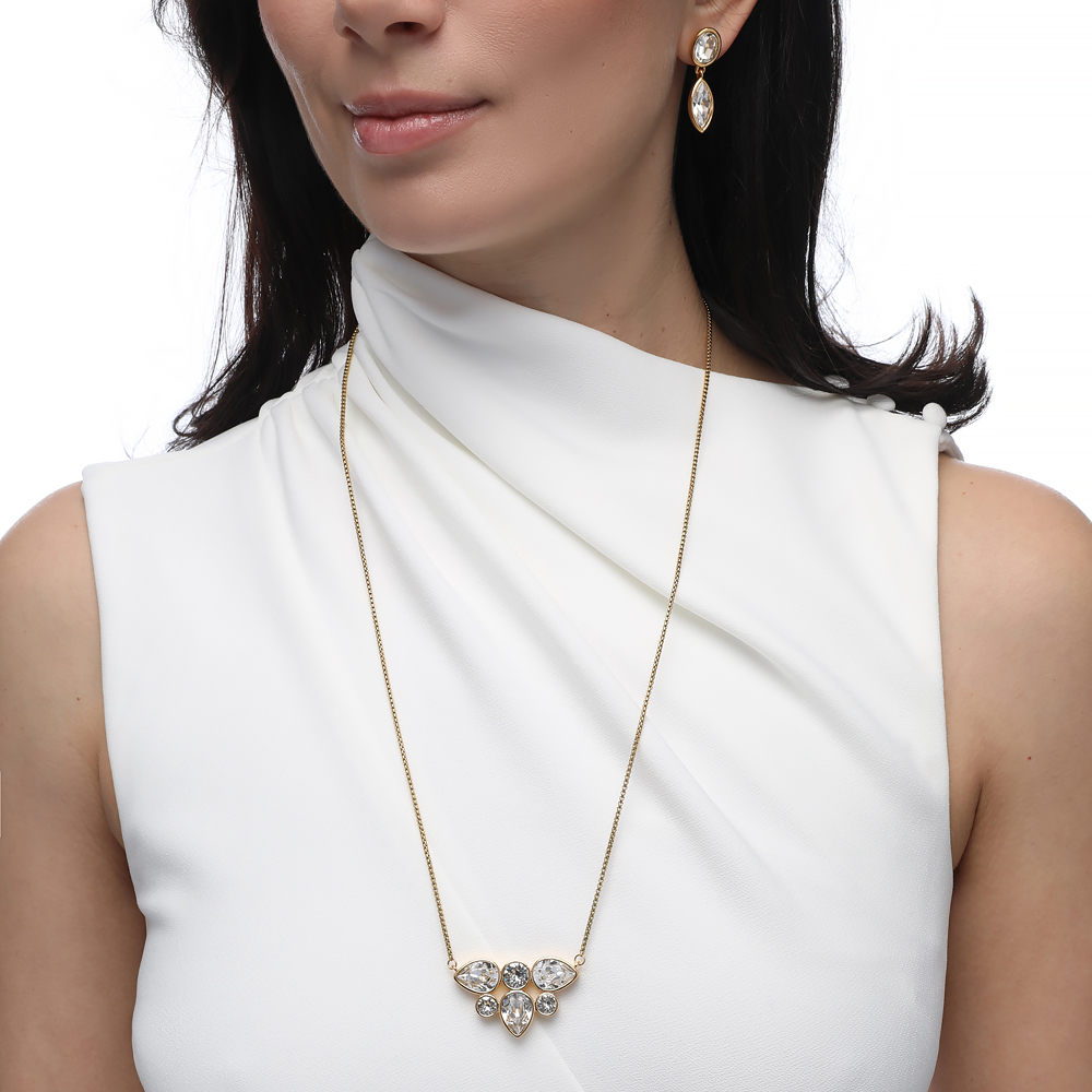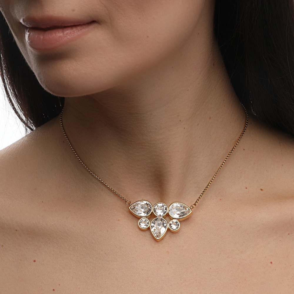 Описание: Изготовлено из ювелирного сплава на основе латуни с гальваническим покрытием золото. Изделие украшают кристаллы SW белого цвета. Длина колье 70см.