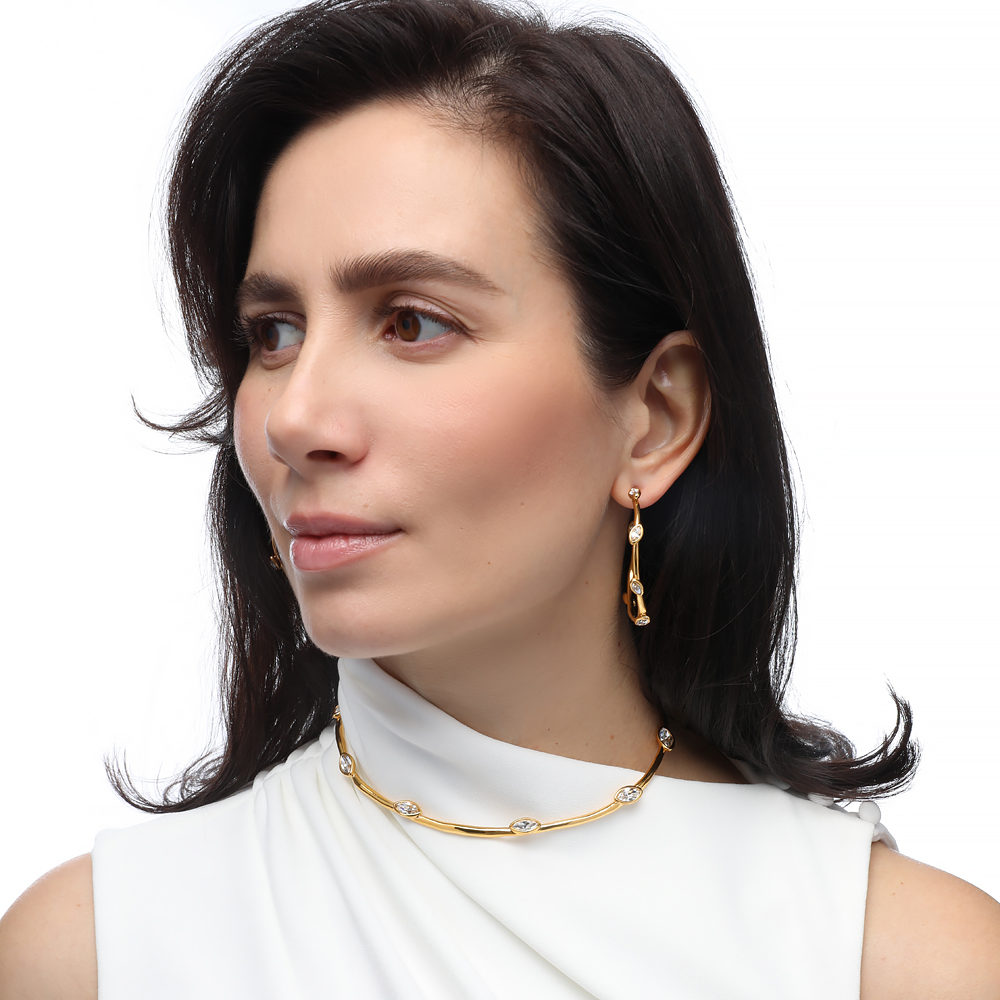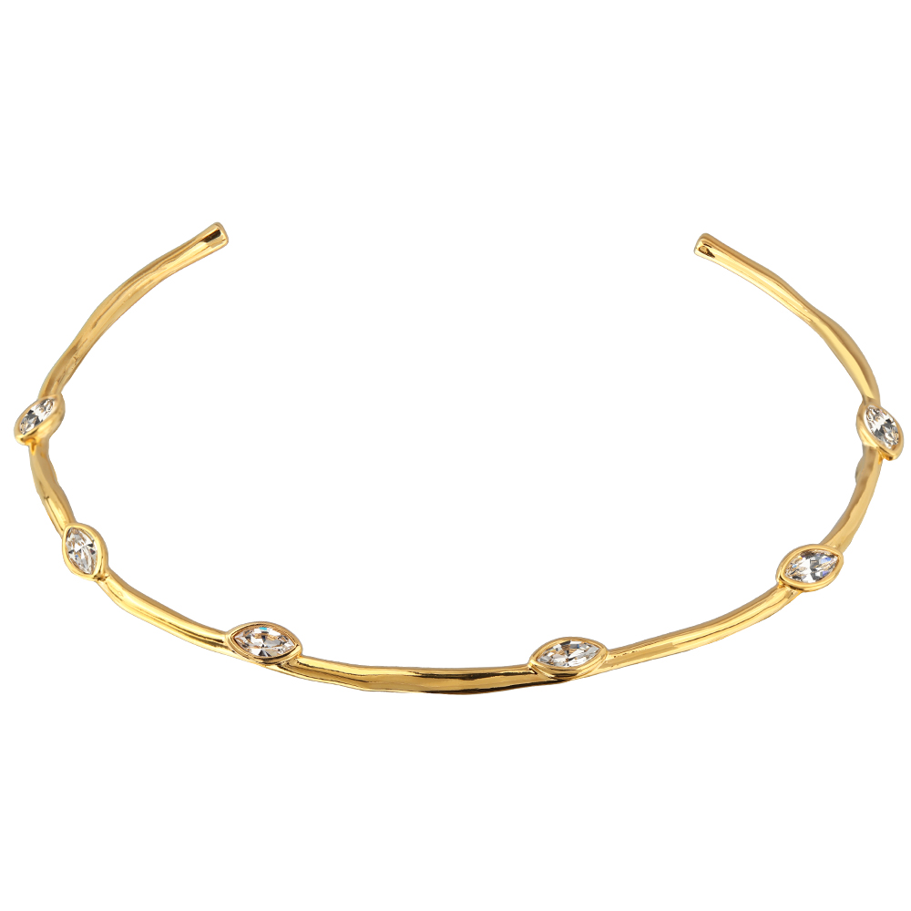Описание: Изготовлено из ювелирного сплава на основе латуни с гальваническим покрытием золотом. Изделие украшают кристаллы SW белого цвета. Длина колье 37см.