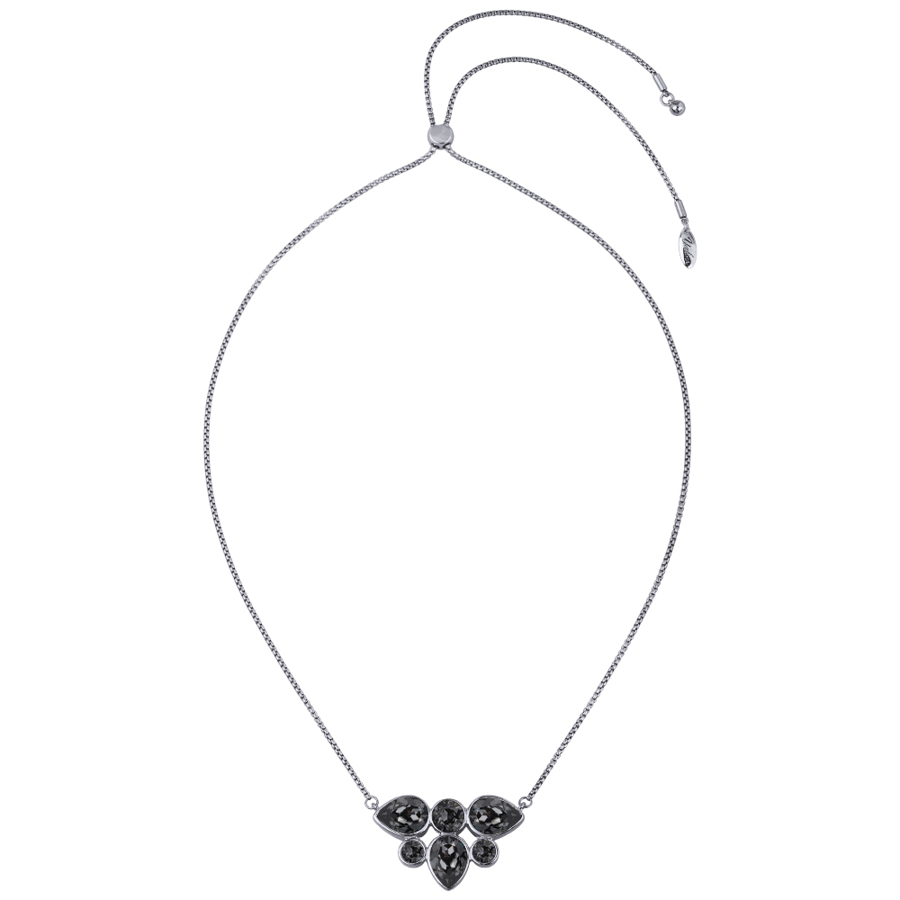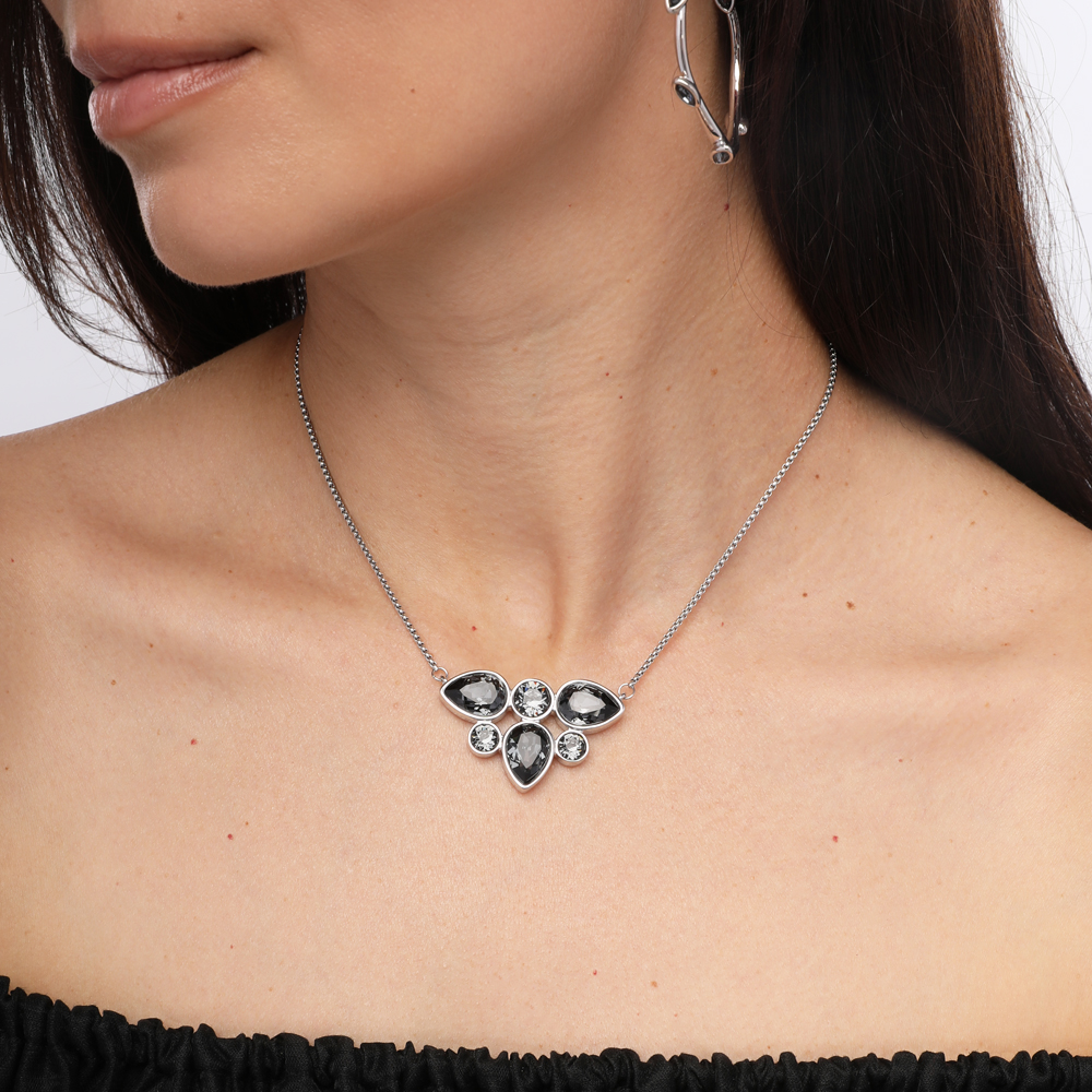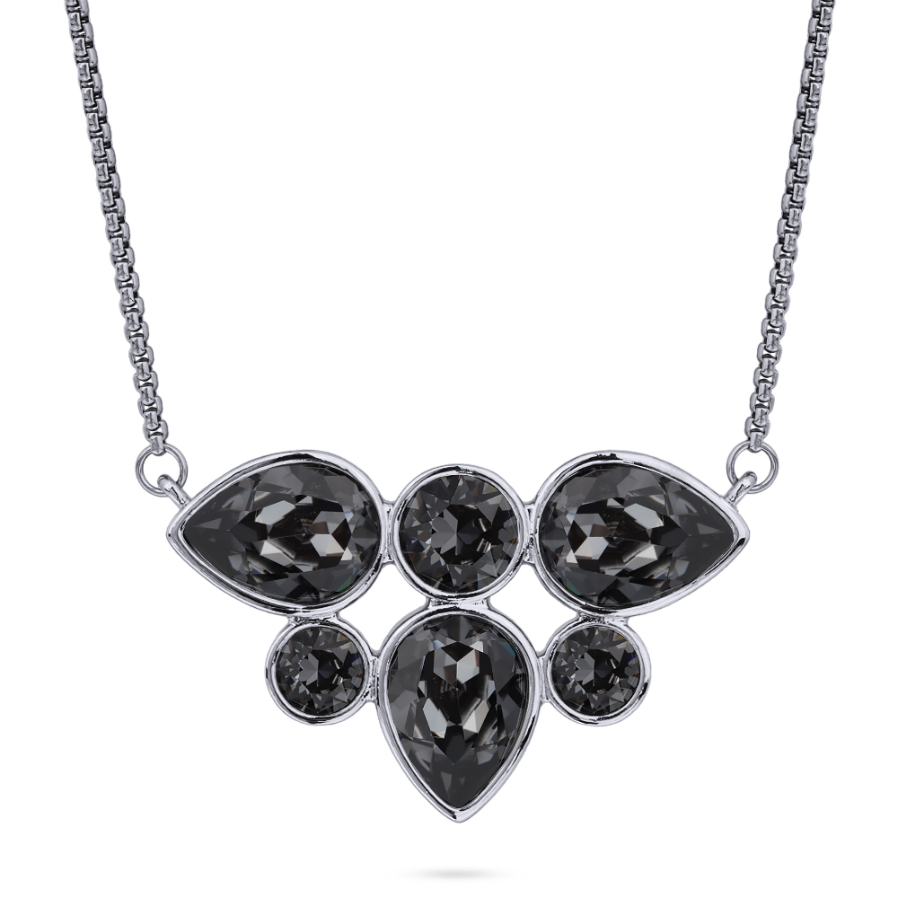 Описание: Изготовлено из ювелирного сплава на основе латуни с гальваническим покрытием родием. Изделие украшают кристаллы SW темно-серого цвета. Длина колье 70см.
