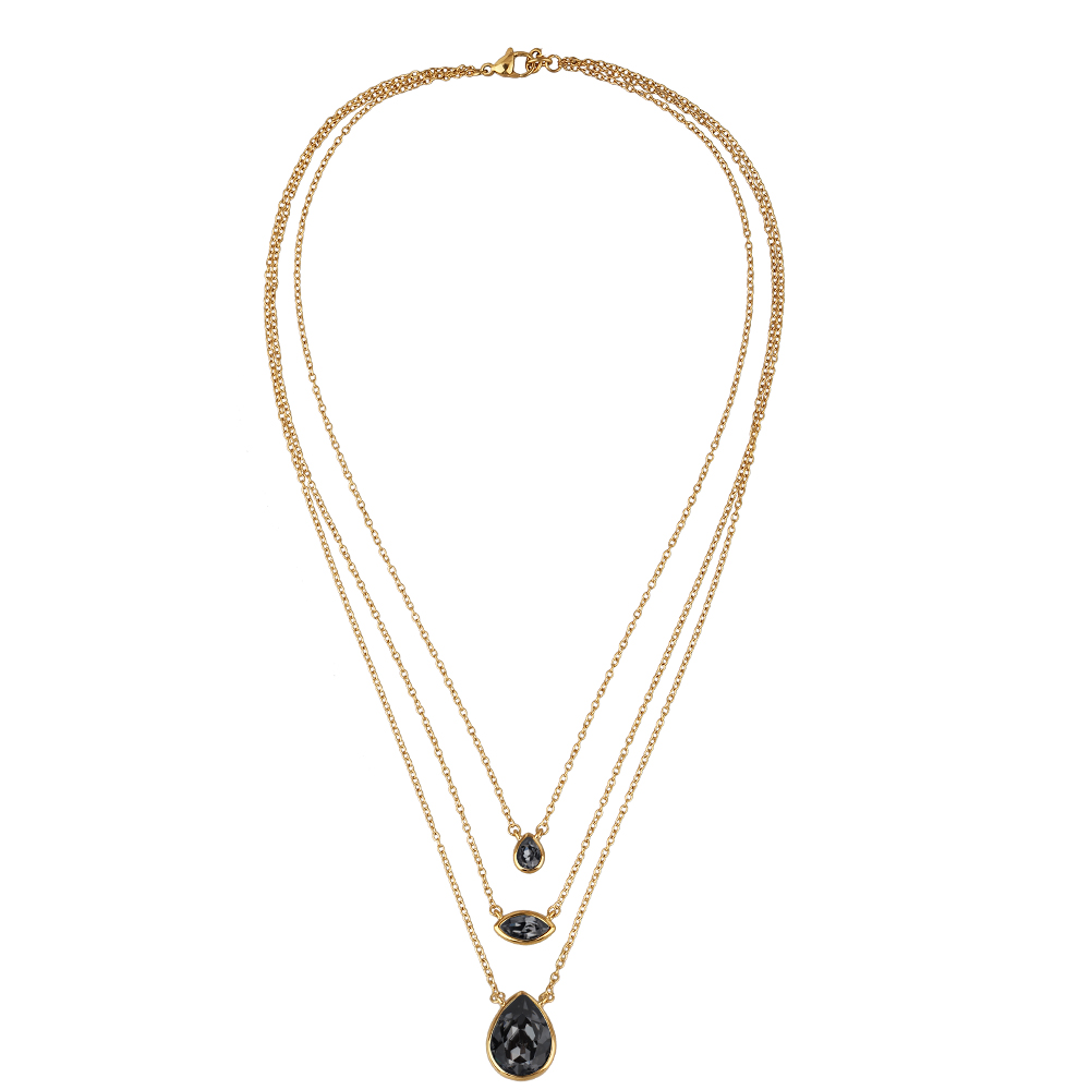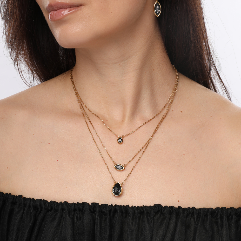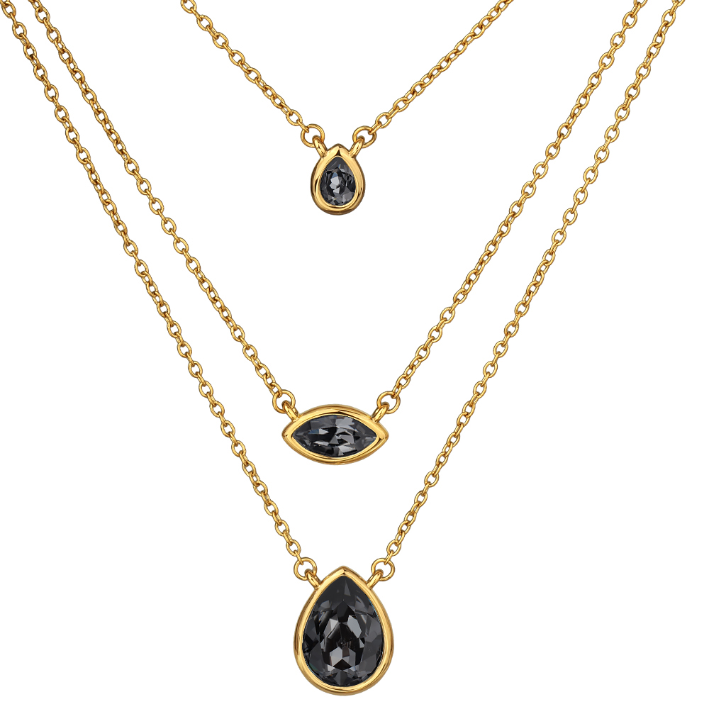 Описание: Изготовлено из ювелирного сплава на основе латуни с гальваническим покрытием золотом. Изделие украшают кристаллы SW темно-серого цвета. Длина колье 47см.