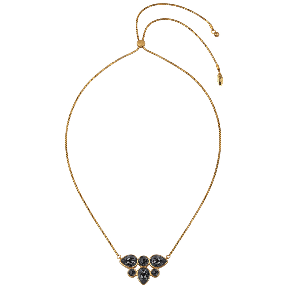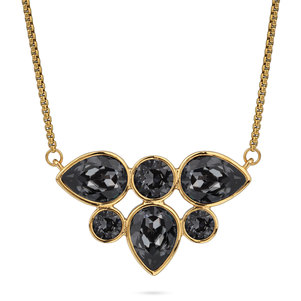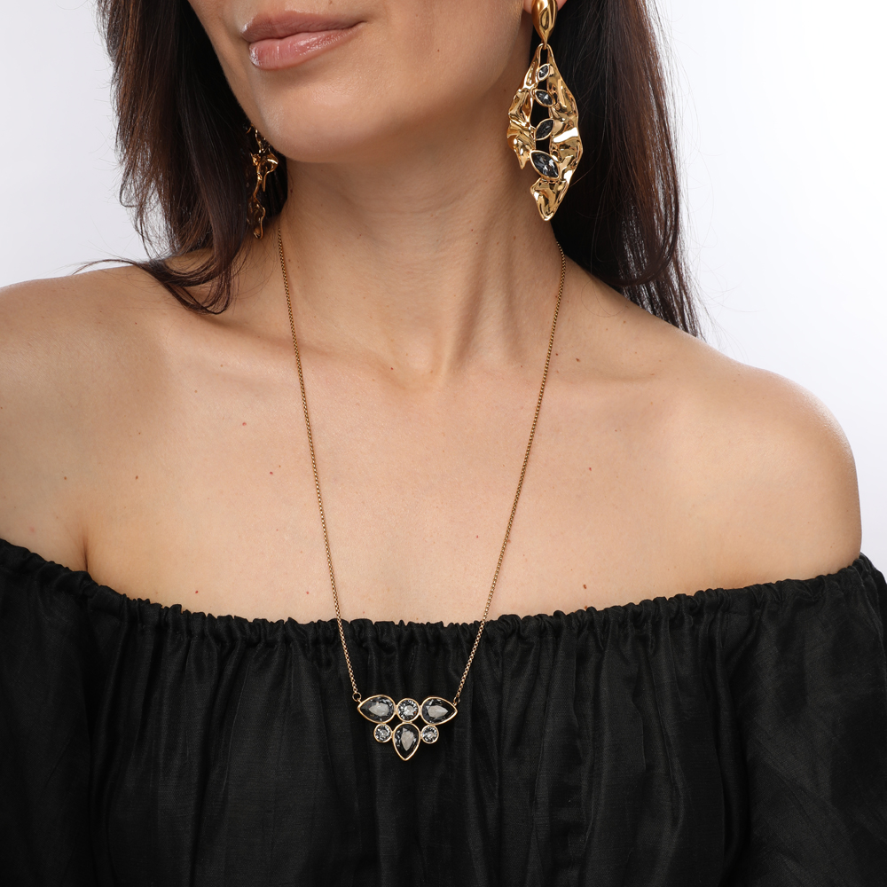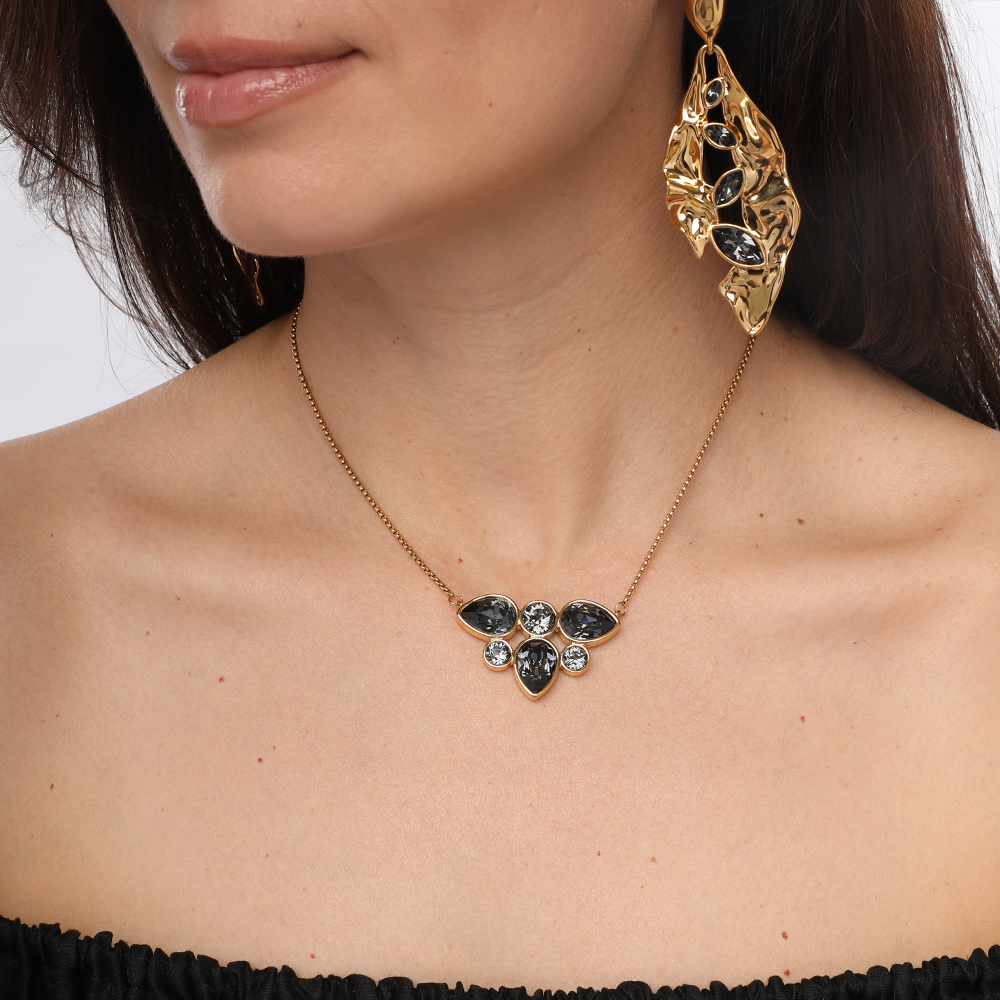 Описание: Изготовлено из ювелирного сплава на основе латуни с гальваническим покрытием золотом. Изделие украшают кристаллы SW темно-серого цвета. Длина колье 70см.
