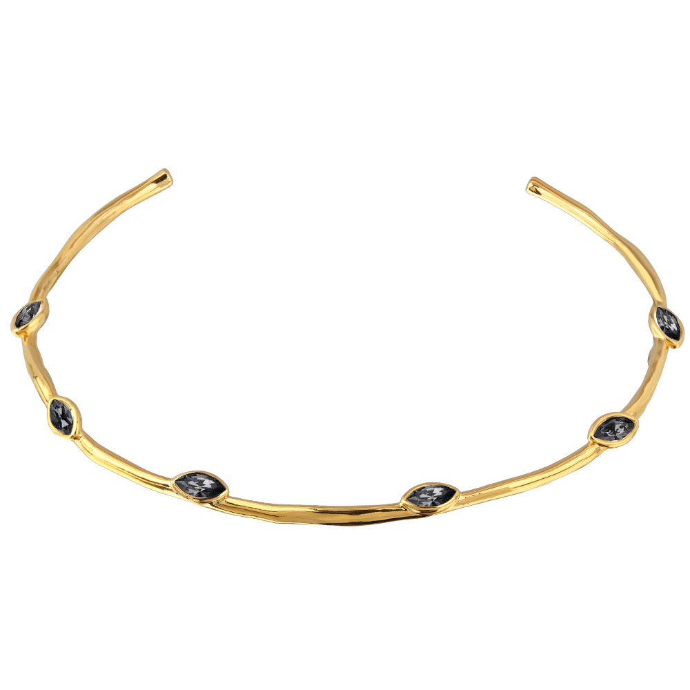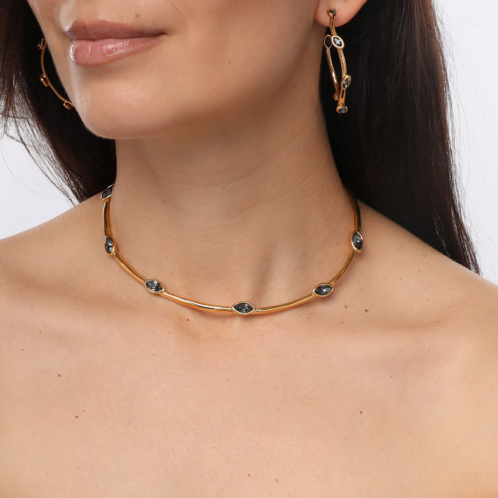 Описание: Изготовлено из ювелирного сплава на основе латуни с гальваническим покрытием золотом. Изделие украшают кристаллы SW темно-серого цвета. Длина колье 37см.