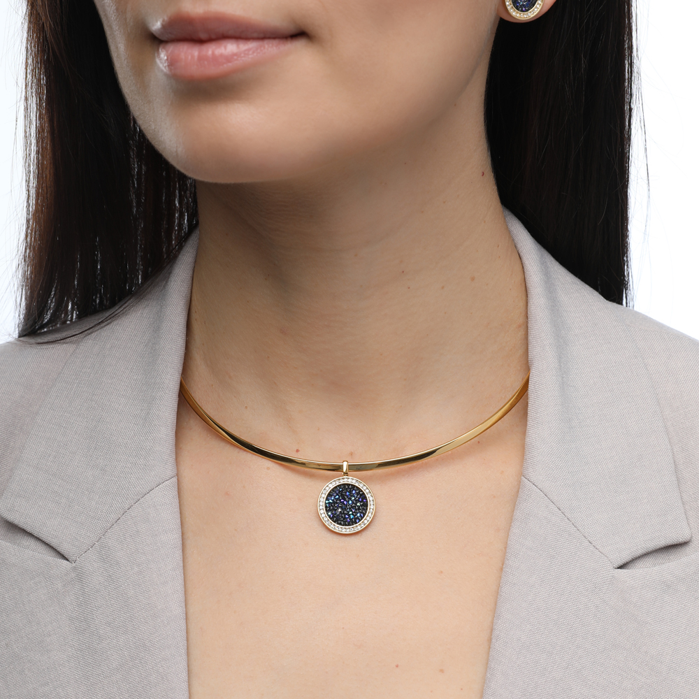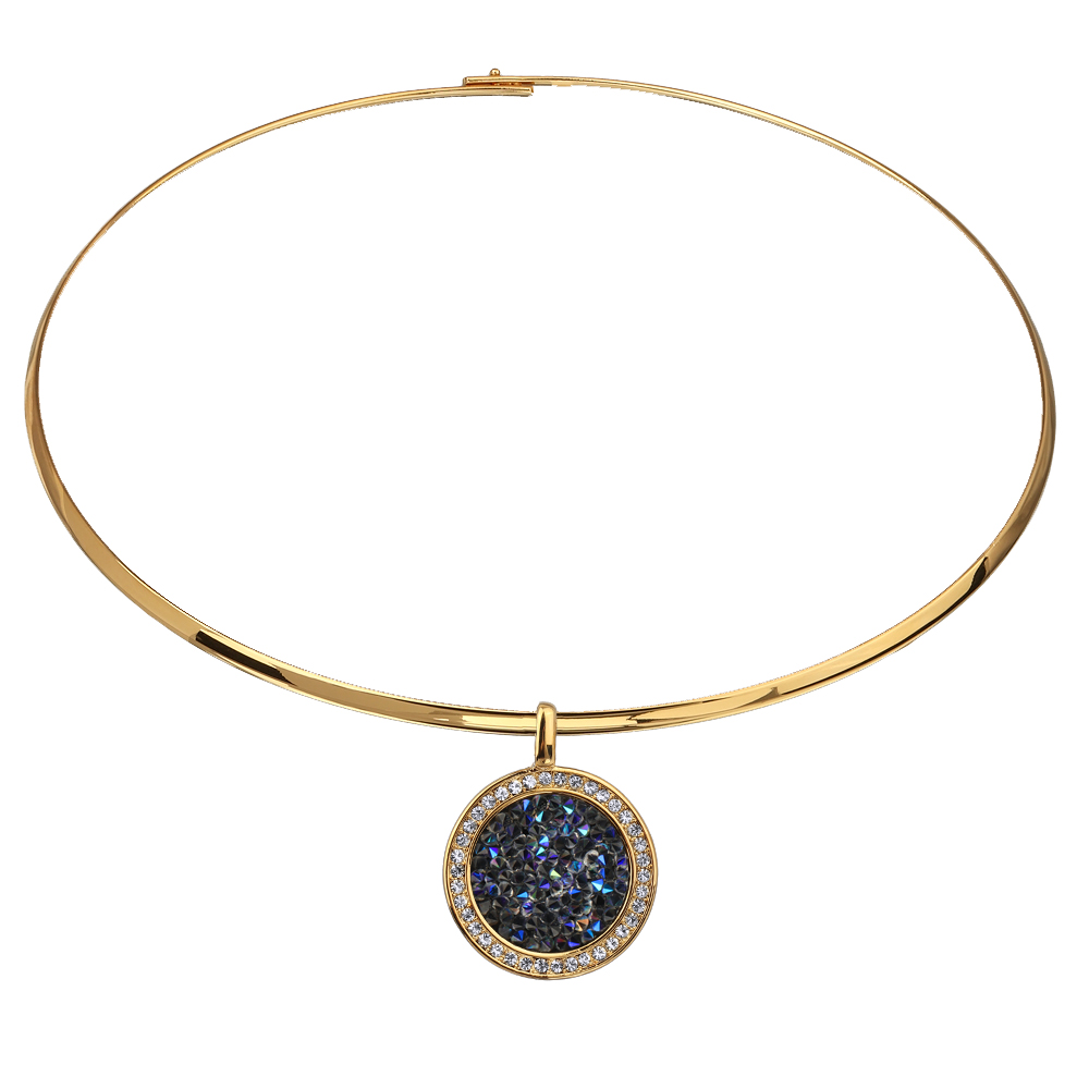 Описание: Изготовлено из ювелирного сплава на основе латуни с гальваническим покрытием золотом. Изделие украшают кристаллы SW синего цвета. Диаметр украшения 2см. Длина колье 42см.