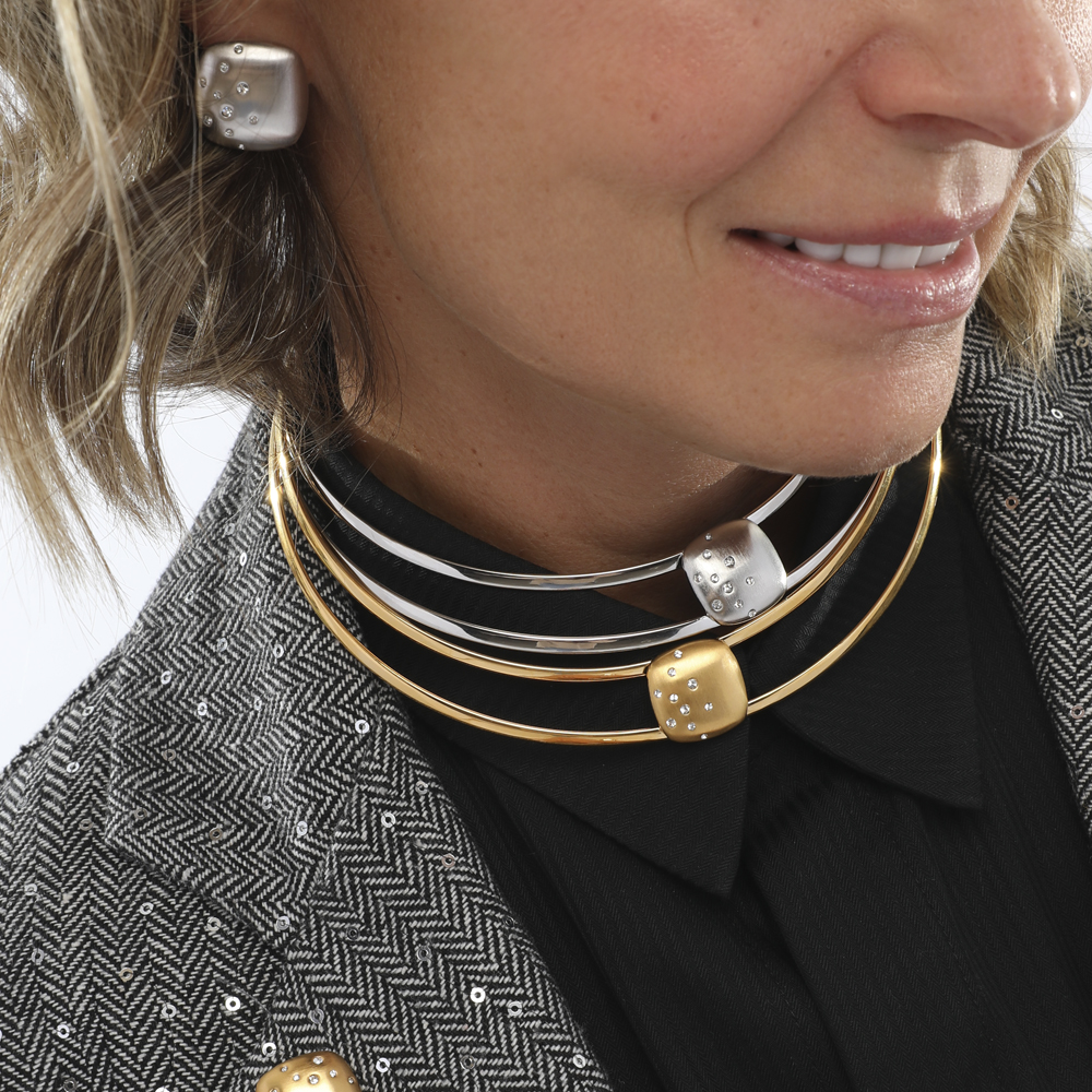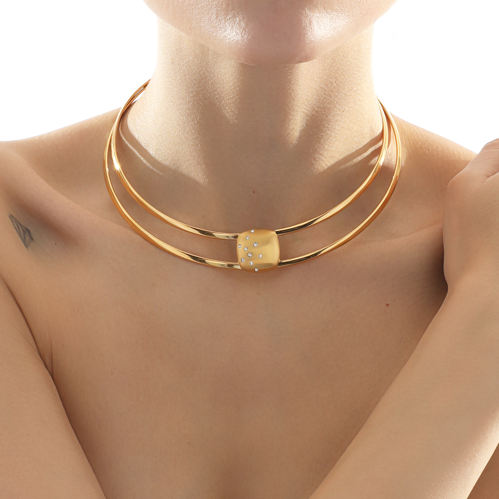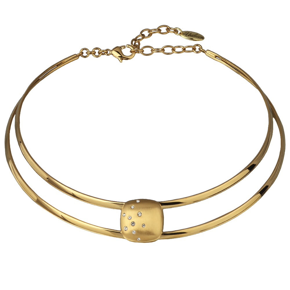 Описание: Изготовлено из ювелирного сплава на основе латуни с гальваническим покрытием сатиновым золотом. Изделие украшают кристаллы SW белого цвета. Длина колье 36-38см.
