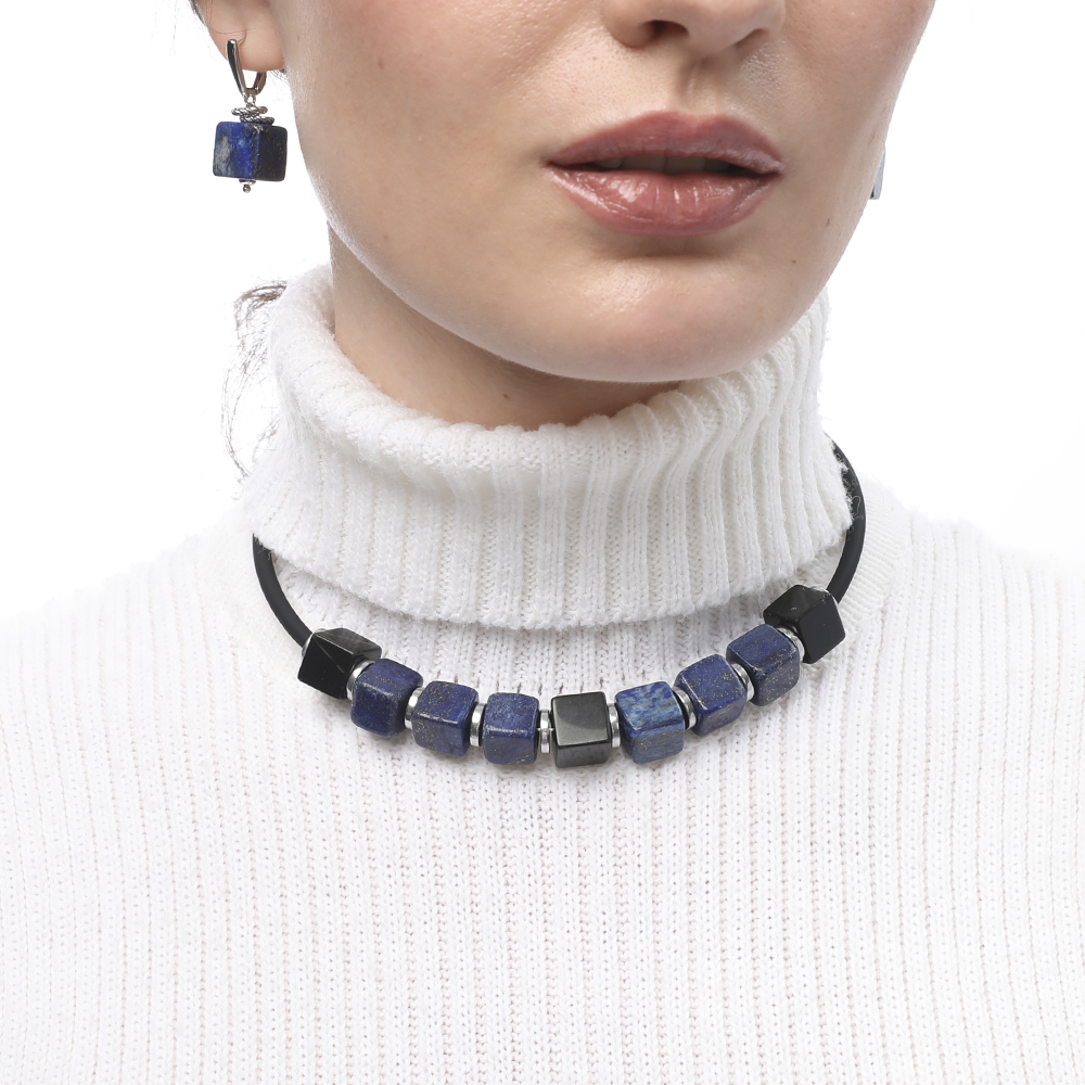 Описание: Изготовлено из ювелирного сплава на основе латуни с гальваническим покрытием родием. Изделие украшают натуральный агат и лазурит размером 13х13мм и черный каучуковый шнурок.