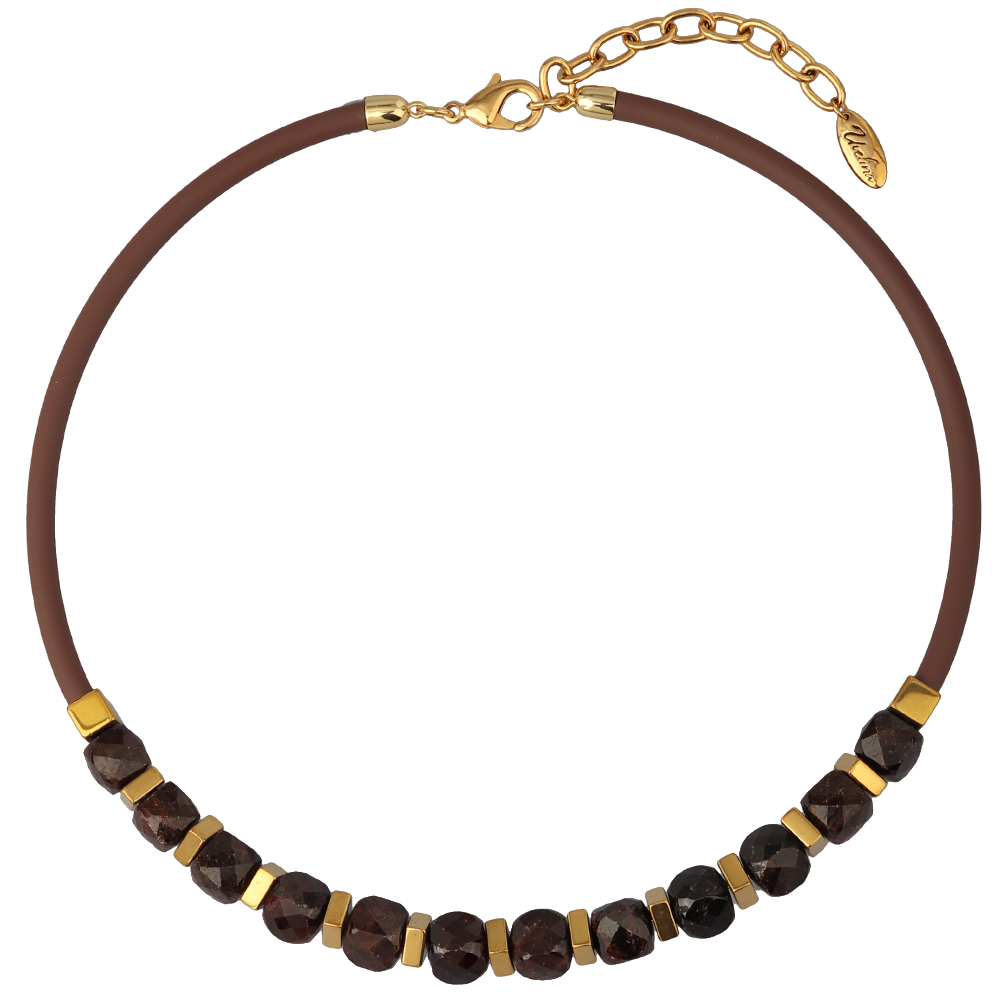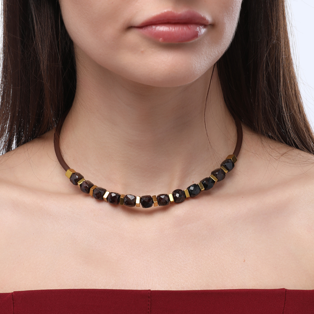 Описание: Изготовлено из ювелирного сплава на основе латуни с гальваническим покрытием золотом. Изделие украшает гранат. Длина каучукового шнурка шоколадного цвета 45см. Замок-карабин с удлинителем 5см.