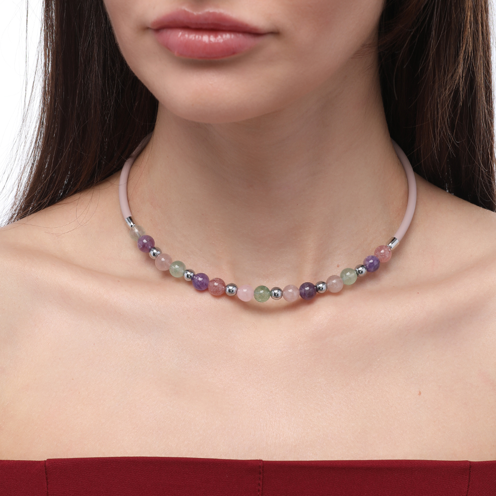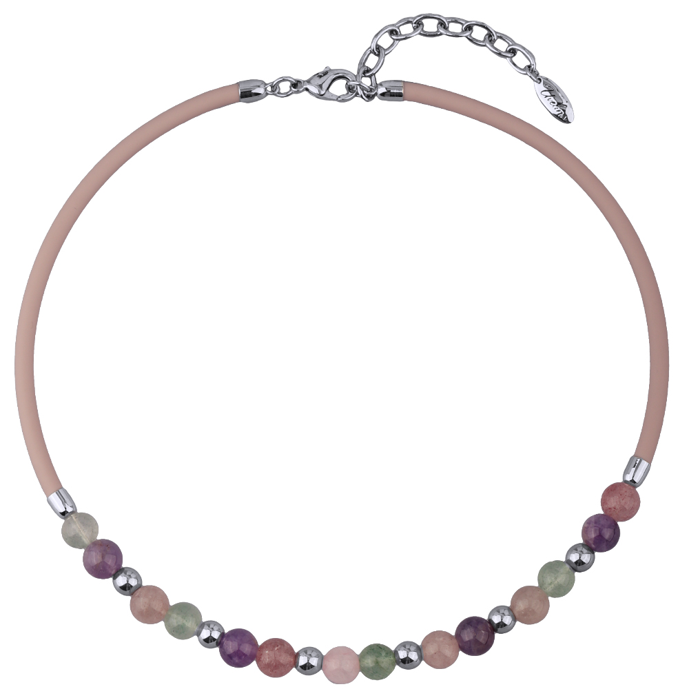 Описание: Изготовлено из ювелирного сплава на основе латуни с гальваническим покрытием родием. Изделие украшает кварц цвета микс. Длина каучукового розового шнурка 45см. Замок-карабин с удлинителем 5см.