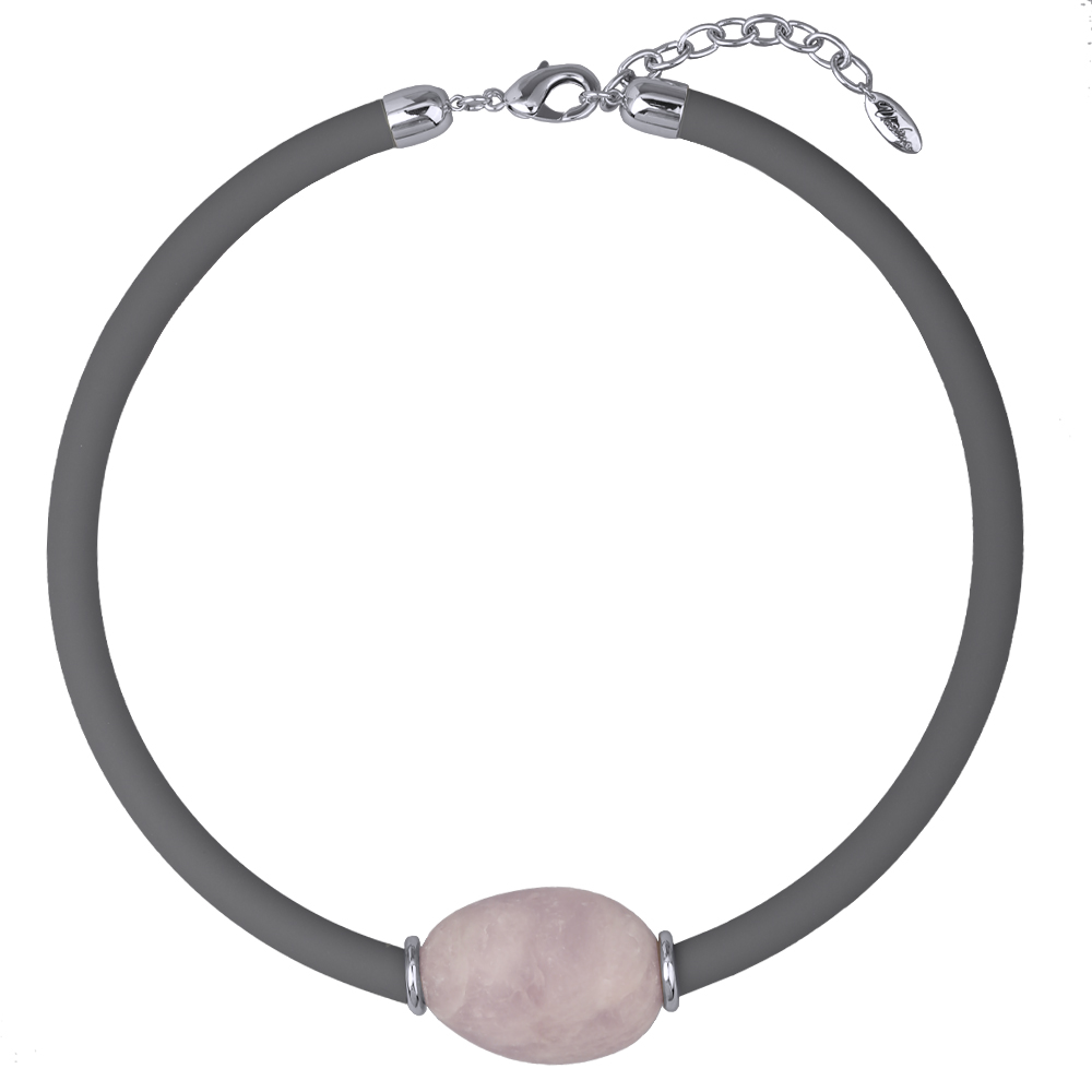 Описание: Изготовлено из ювелирного сплава на основе латуни с гальваническим покрытием родием. Изделие украшают розовый кварц и темно-серый каучуковый шнурок. Длина каучукового шнурка 45см. Замок-карабин с удлинителем 5см.
