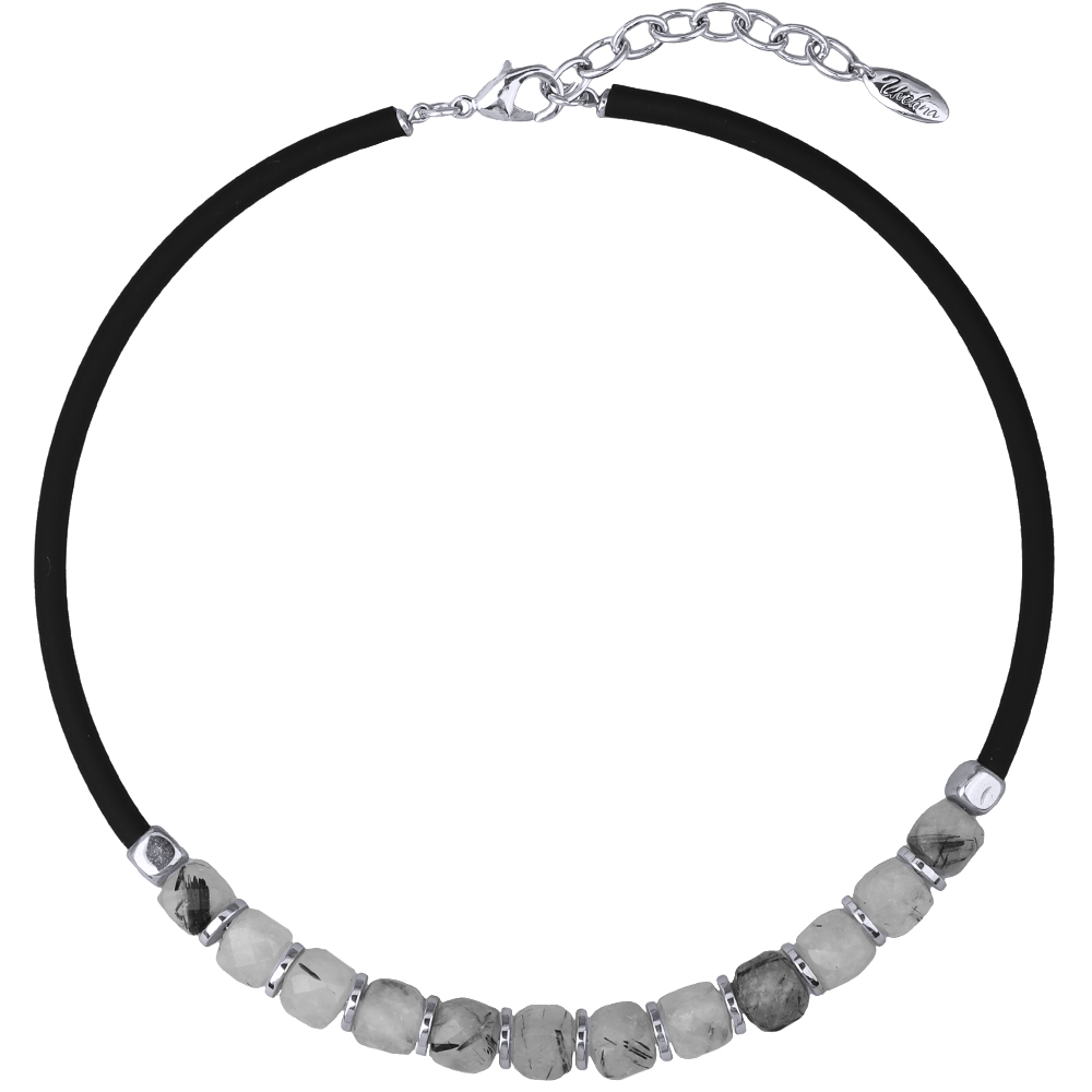 Описание: Изготовлено из ювелирного сплава на основе латуни с гальваническим покрытием родием. Изделие украшают натуральный кварц серого цвета и черный каучуковый шнурок. Длина 40см. Замок-карабин с удлинителем 5см.