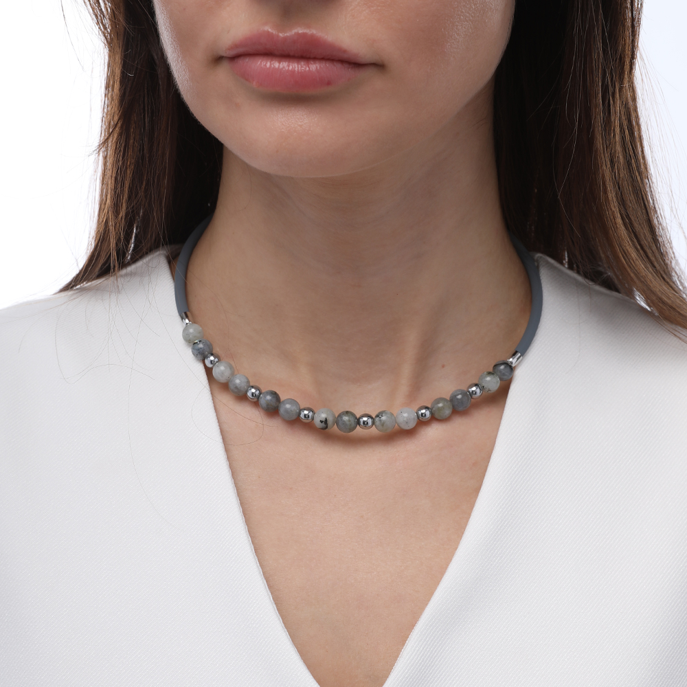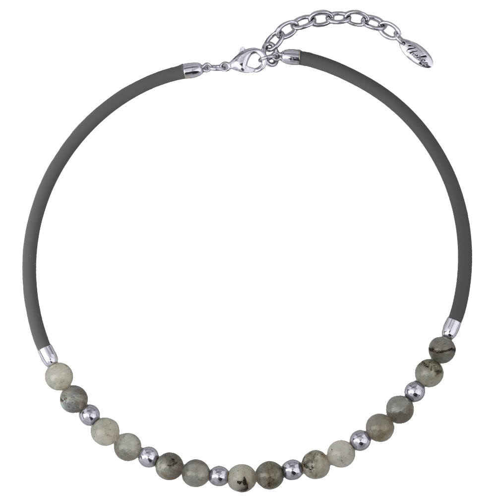 Описание: Изготовлено из ювелирного сплава на основе латуни с гальваническим покрытием родием. Изделие украшает лунный опал. Длина графитового каучукового шнурка 45см. Замок-карабин с удлинителем 5см.