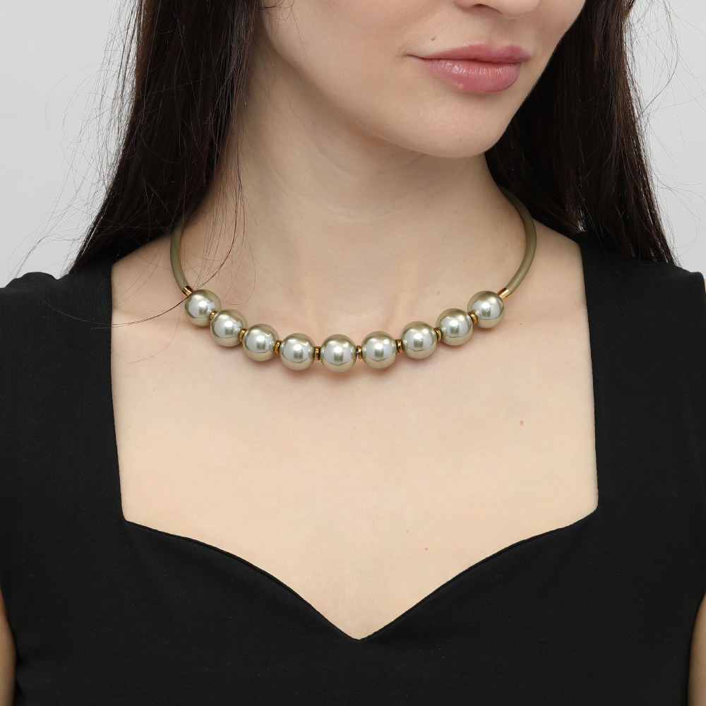 Описание: Изготовлено из ювелирного сплава на основе латуни с гальваническим покрытием золотом. Изделие украшает жемчуг Майорка цвета медовая роса диаметром 14мм. Длина оливкового каучукового шнурка 45см. Замок-карабин с удлинителем 5см.