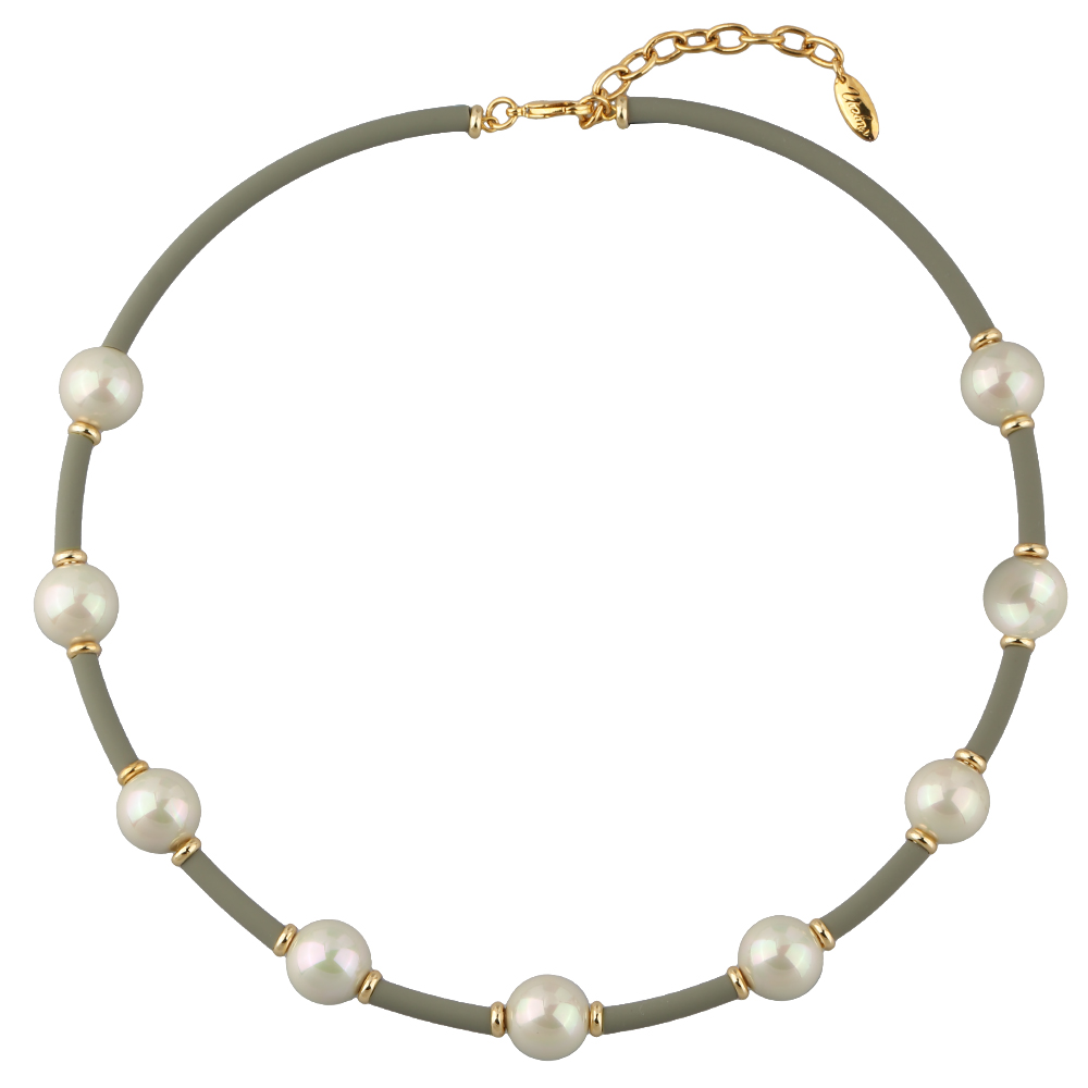 Описание: Изготовлено из ювелирного сплава на основе латуни с гальваническим покрытием золотом. Изделие украшает жемчуг Майорка цвета медовая роса диаметром 14мм. Длина оливкового каучукового шнурка 42см. Замок-карабин с удлинителем 5см.