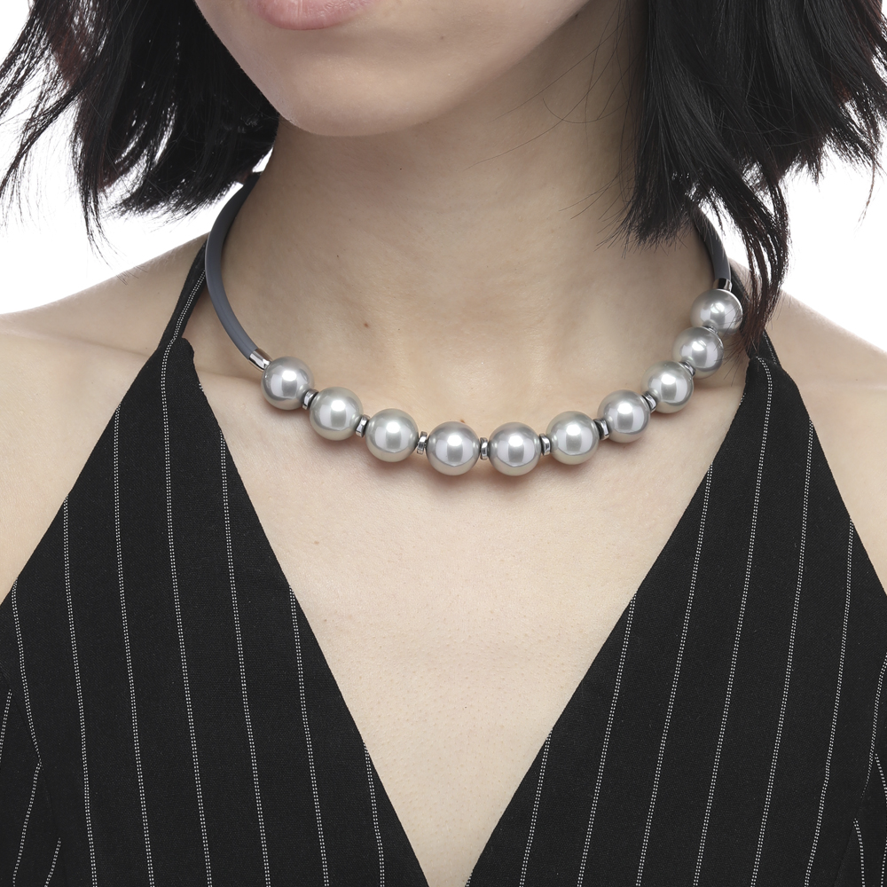 Описание: Изготовлено из ювелирного сплава на основе латуни с гальваническим покрытием родием. Изделие украшает жемчуг Майорка серо-голубого цвета диаметром 14мм. Длина серого каучукового шнурка 45см. Замок-карабин с удлинителем 5см.