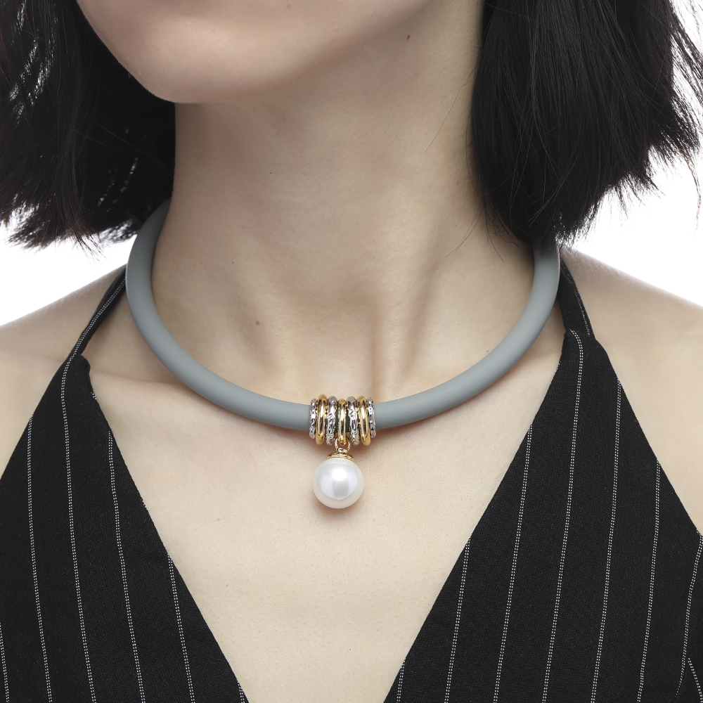 Описание: Изготовлено из ювелирного сплава на основе латуни с гальваническим покрытием золотом и родием. Изделие украшает круглый жемчуг Майорка белого цвета диаметром 16мм. Длина серого каучукового шнурка 40-45см, диаметр 8мм.