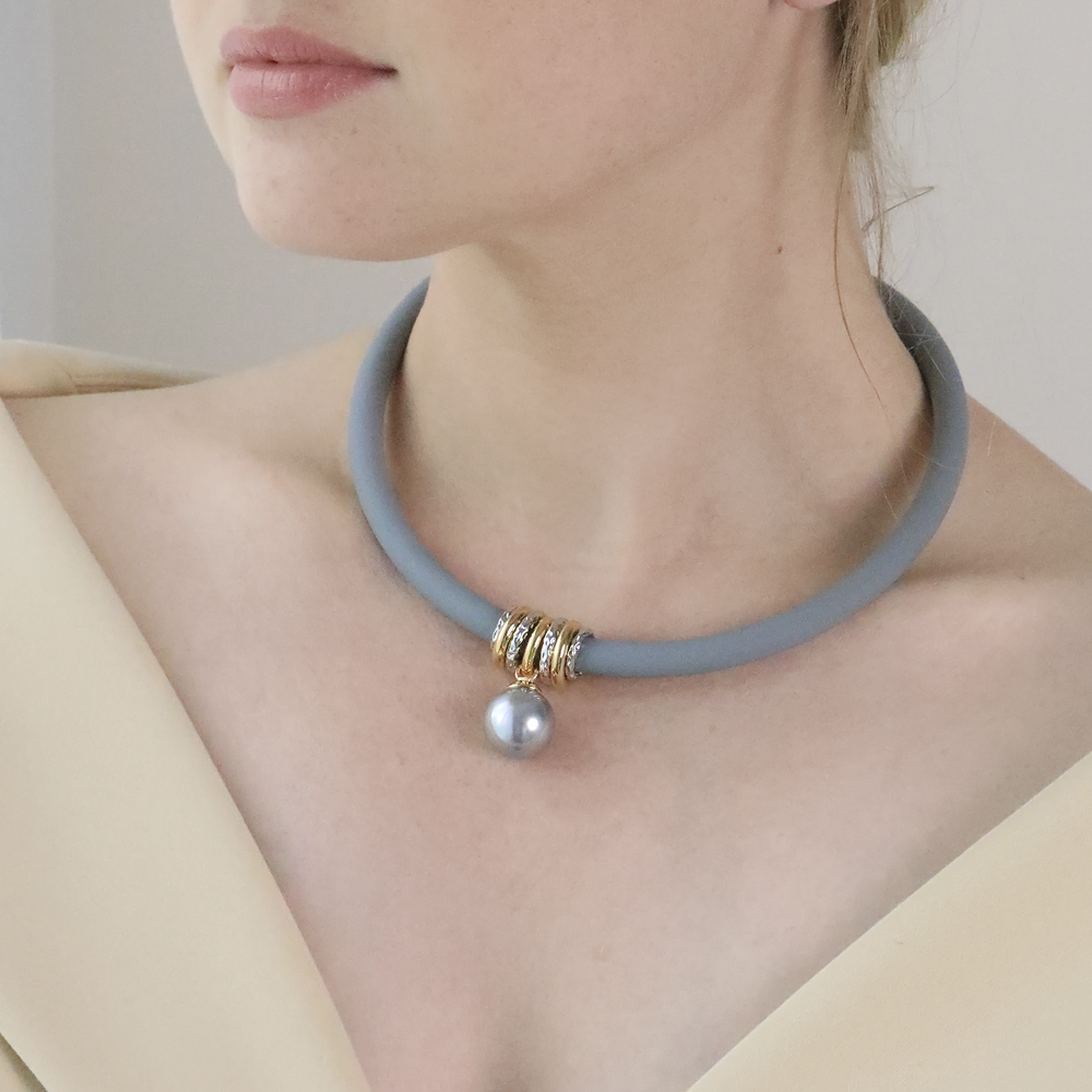 Описание: Изготовлено из ювелирного сплава на основе латуни с гальваническим покрытием родием и золотом. Изделие украшает круглый жемчуг Майорка серо-голубого цвета диаметром 16мм. Длина серого каучукового шнурка 40см, диаметр 8мм. Замок-карабин с удлинителем 5см.