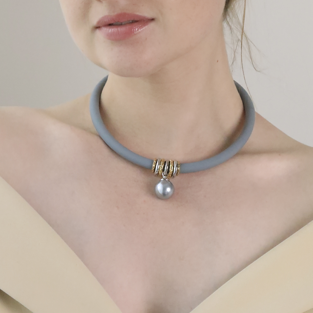 Описание: Изготовлено из ювелирного сплава на основе латуни с гальваническим покрытием золотом и родием. Изделие украшает круглый жемчуг Майорка серо-голубого цвета диаметром 16мм. Длина серого каучукового шнурка 40см, диаметр 8мм. Замок-карабин с удлинителем 5см.
