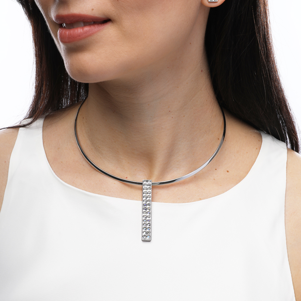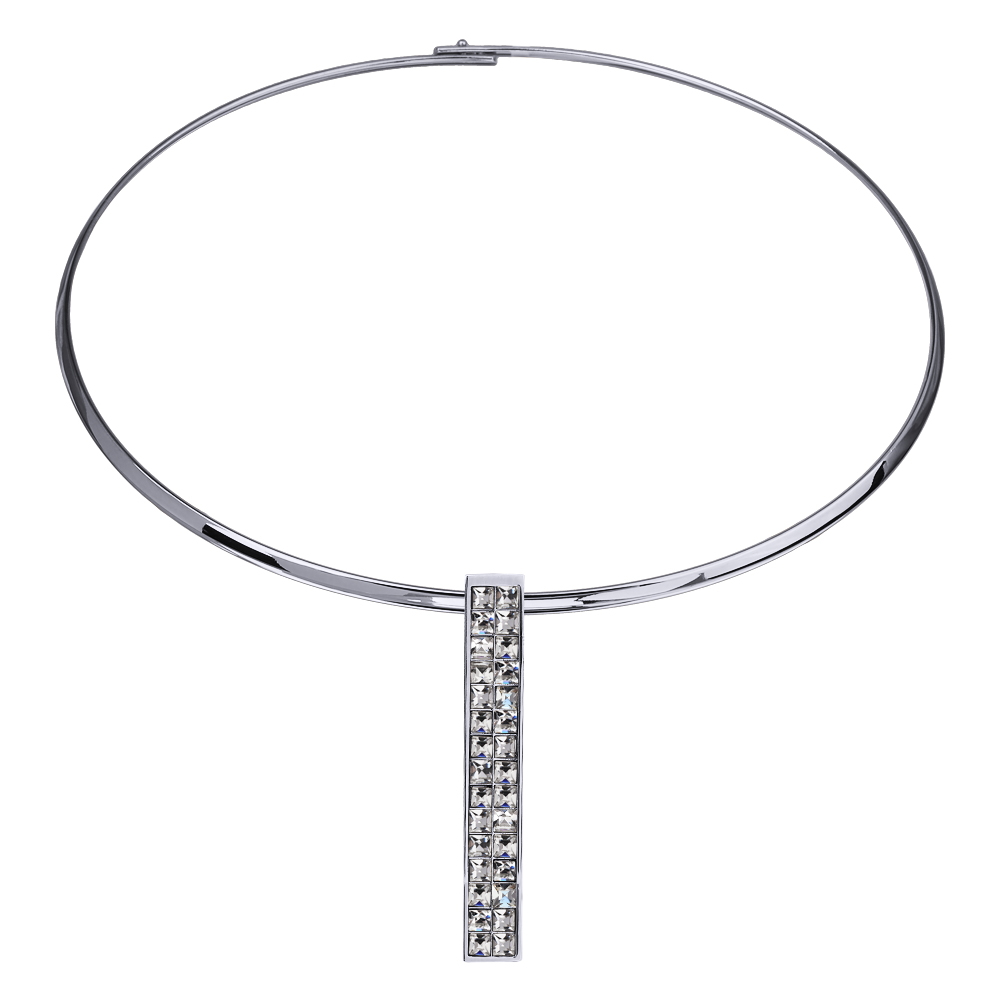 Описание: Изготовлено из ювелирного сплава на основе латуни с гальваническим покрытием родием. Изделие украшают кристаллы SW белого цвета. Длина колье 42см. Размер кулона 5, 3х0, 8см.