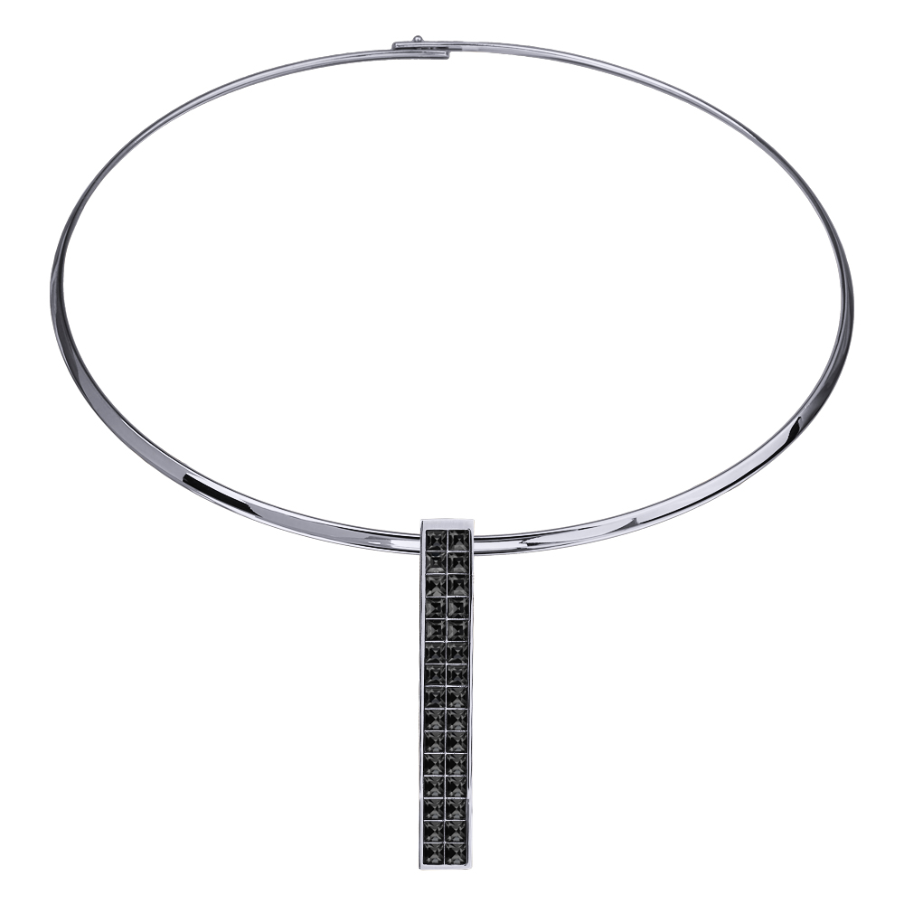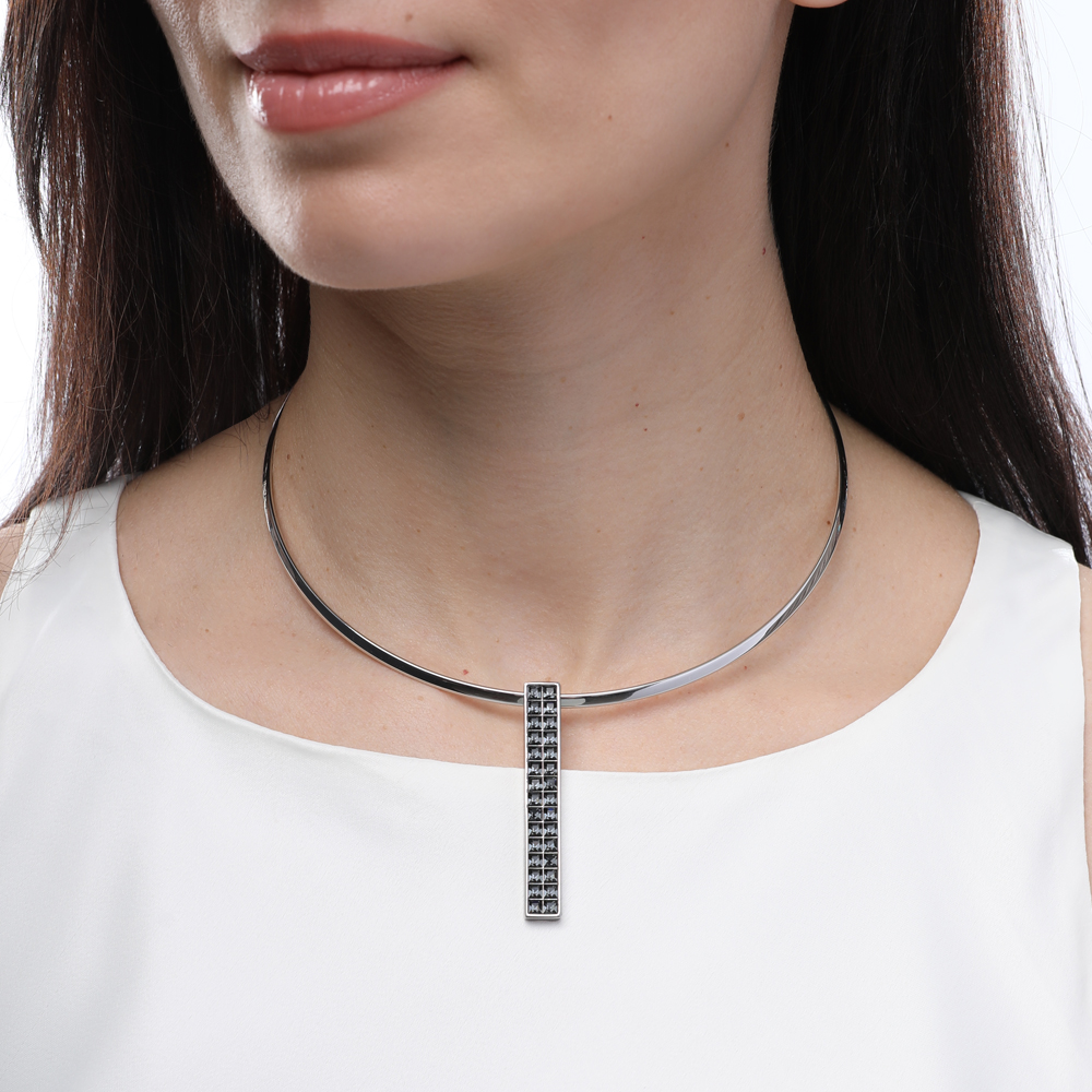 Описание: Изготовлено из ювелирного сплава на основе латуни с гальваническим покрытием родием. Изделие украшают кристаллы SW темно-серого цвета. Длина колье 42см. Размер кулона 5, 3х0, 8см.