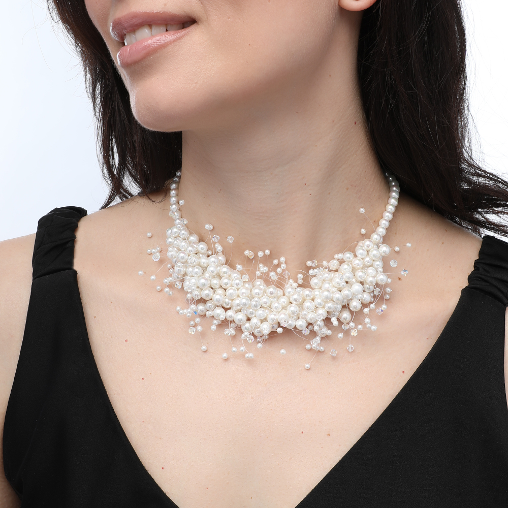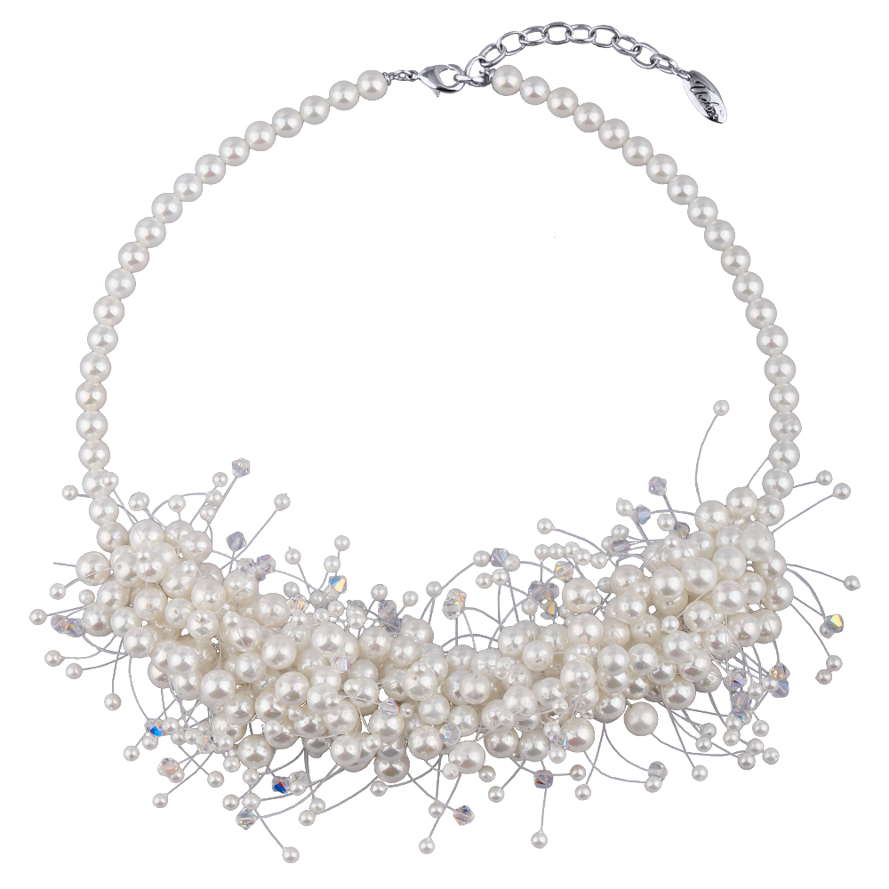 Описание: Изготовлено из ювелирного сплава на основе латуни с гальваническим покрытием родием. Изделие украшают белые жемчуг Майорка диаметром 6мм и кристаллы SW размером 7х7мм. Длина 40см. Замок-карабин с удлинителем 5см.